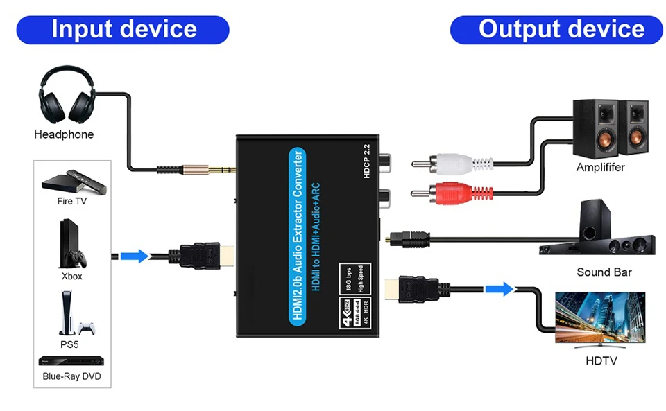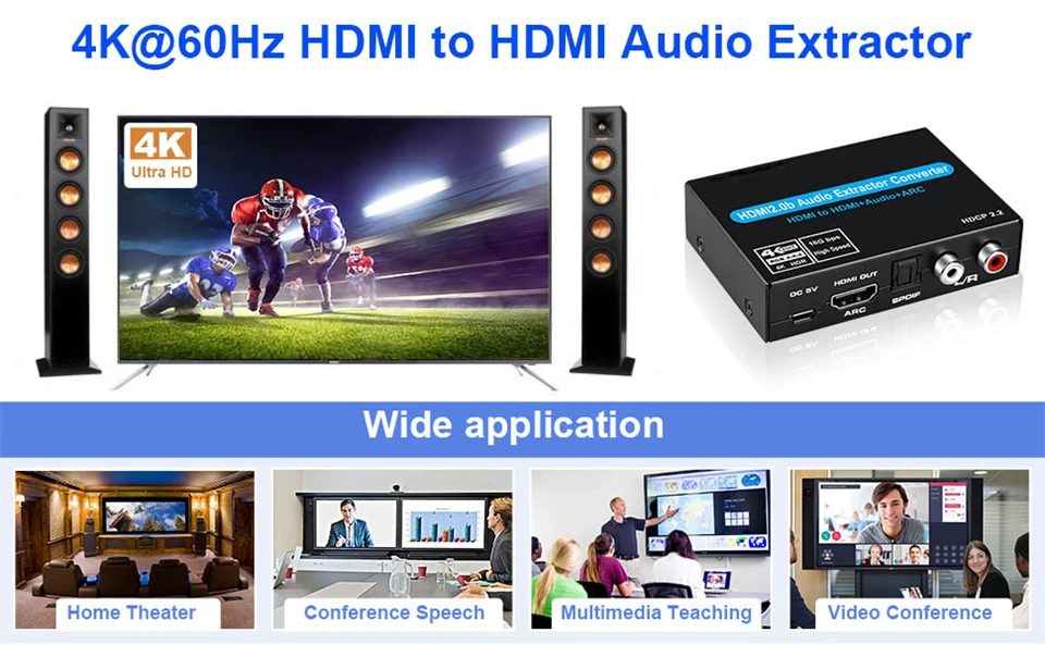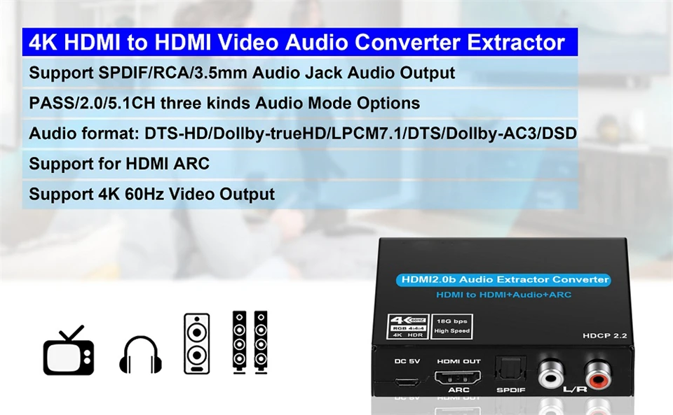Extractor de audio HDMI2.0 4K 60Hz compatible con HDMI2.0b de 5,1 canales HD-MI a HDMIMIAudio ARC Switch con audio toslink estéreo para Apple TV PS4
