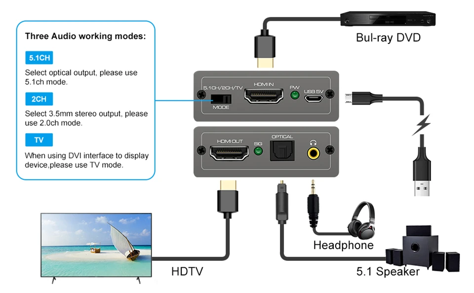 【3 modos de trabajo】Este extractor de audio tiene modo 2.0CH, 5.1CH y TV.Seleccione salida estéreo de 3,5 mm, utilice el modo 2.0CH.Seleccione la salida óptica, utilice el modo 5,1CH.Cuando utilice los dos primeros modos y descubra que no se emite señal de audio, use el modo TV. Nota: Si no se obtiene sonido, configure el sonido de la fuente de señal al formato PCM.