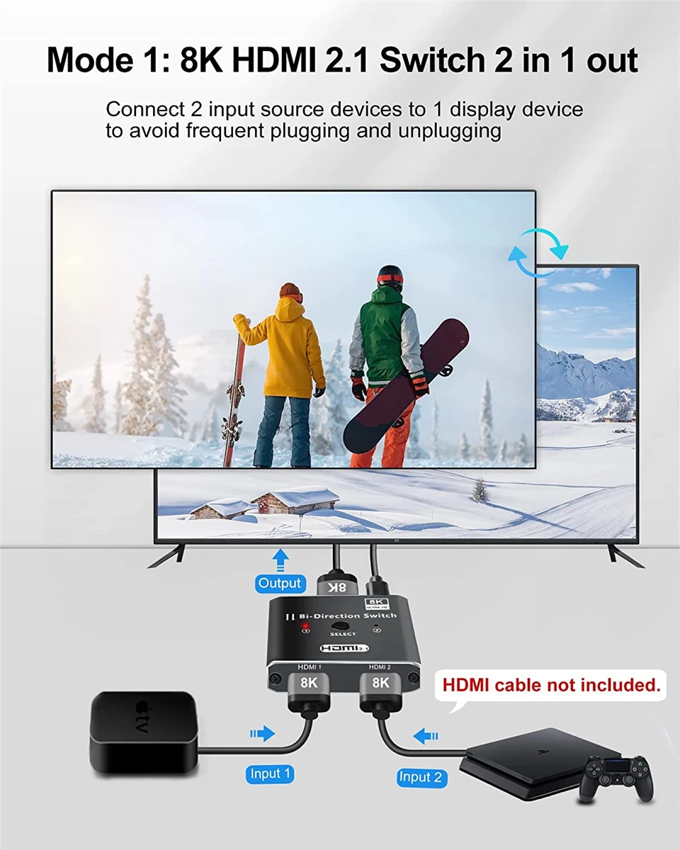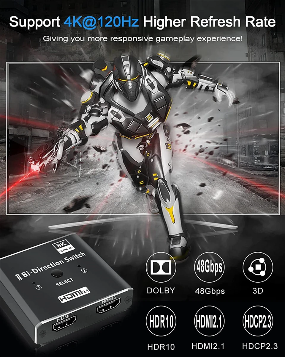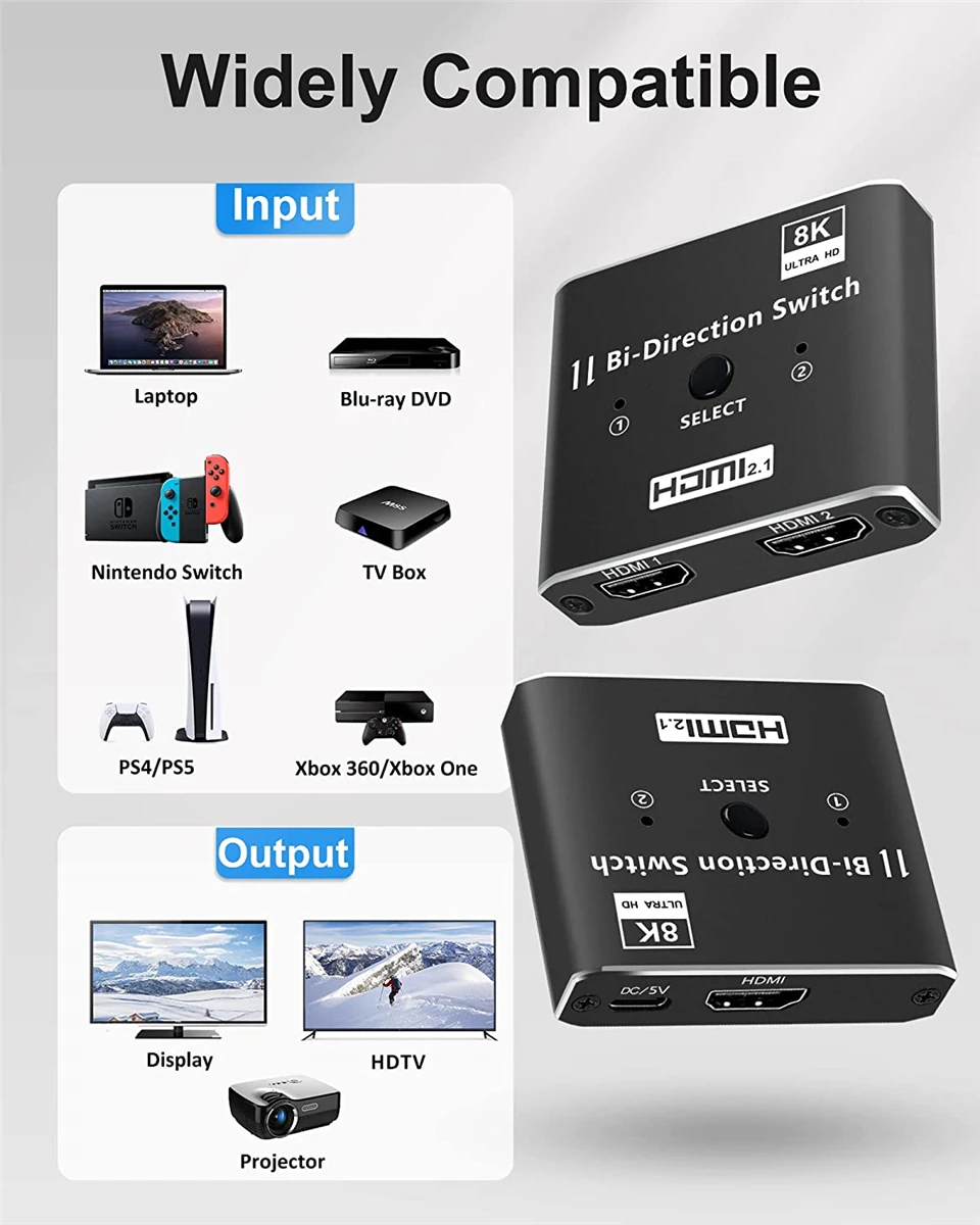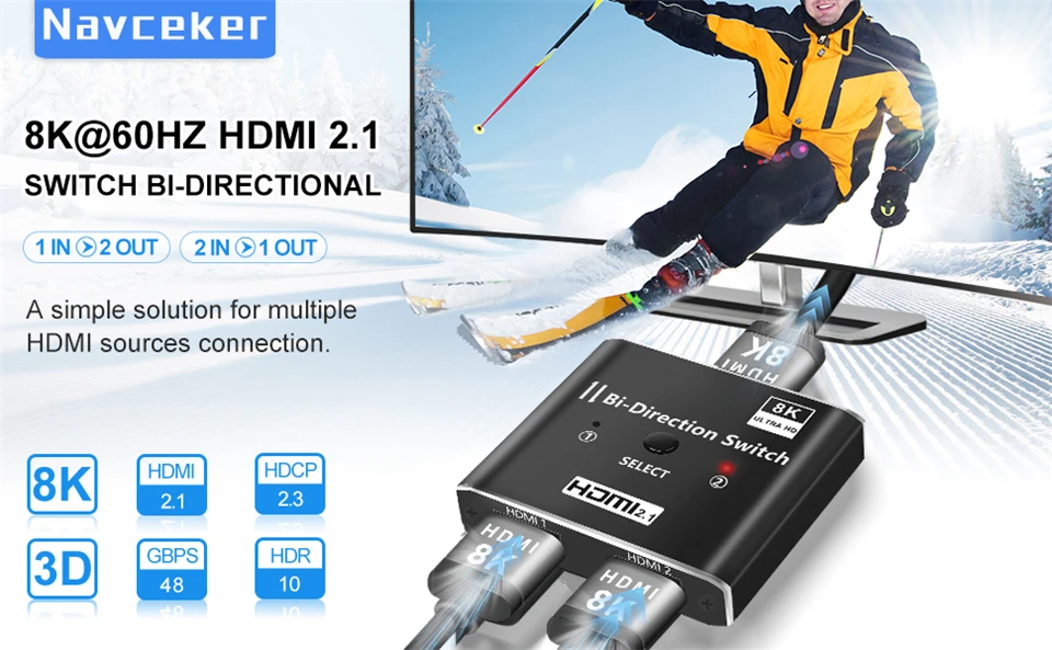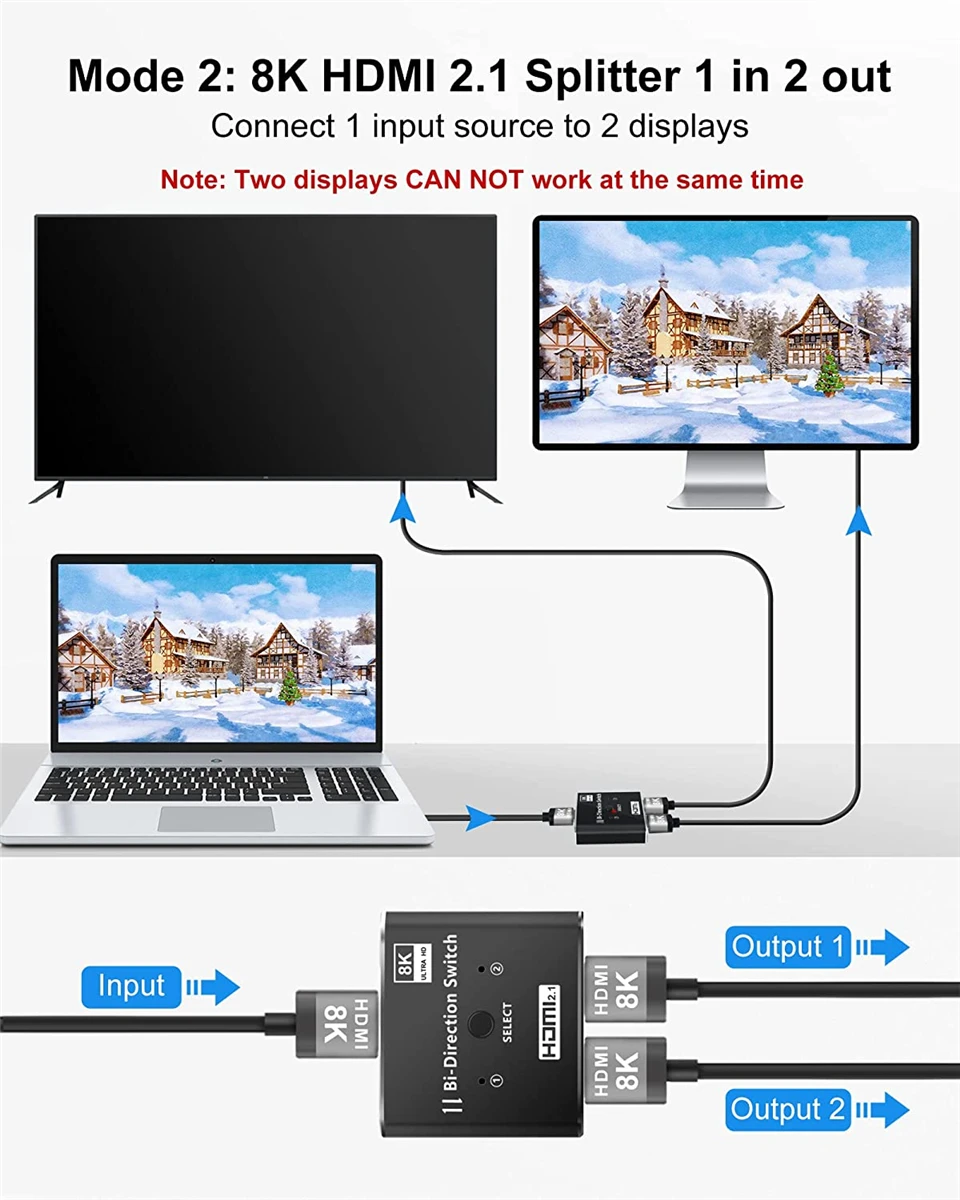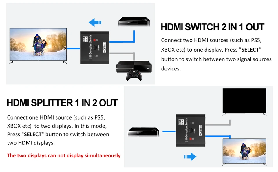 Navceker 8K @ 60Hz 4K @ 120Hz 1080P @ 240Hz El interruptor bidireccional HDMI puede conectar dos fuentes HDMI como reproductor blu-ray y PS3, PS4, PS4 Pro, PS5, etc., a una sola pantalla HDMI como HDTV. Además, también puede cambiar una fuente de señal a dos pantallas (al igual que el divisor 1*2, pero es diferente que las 2 pantallas no pueden funcionar al mismo tiempo).