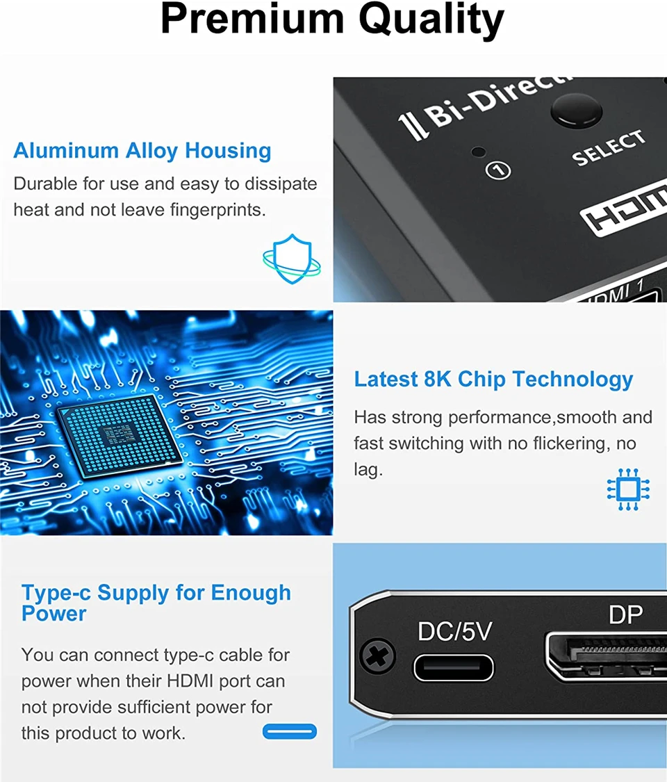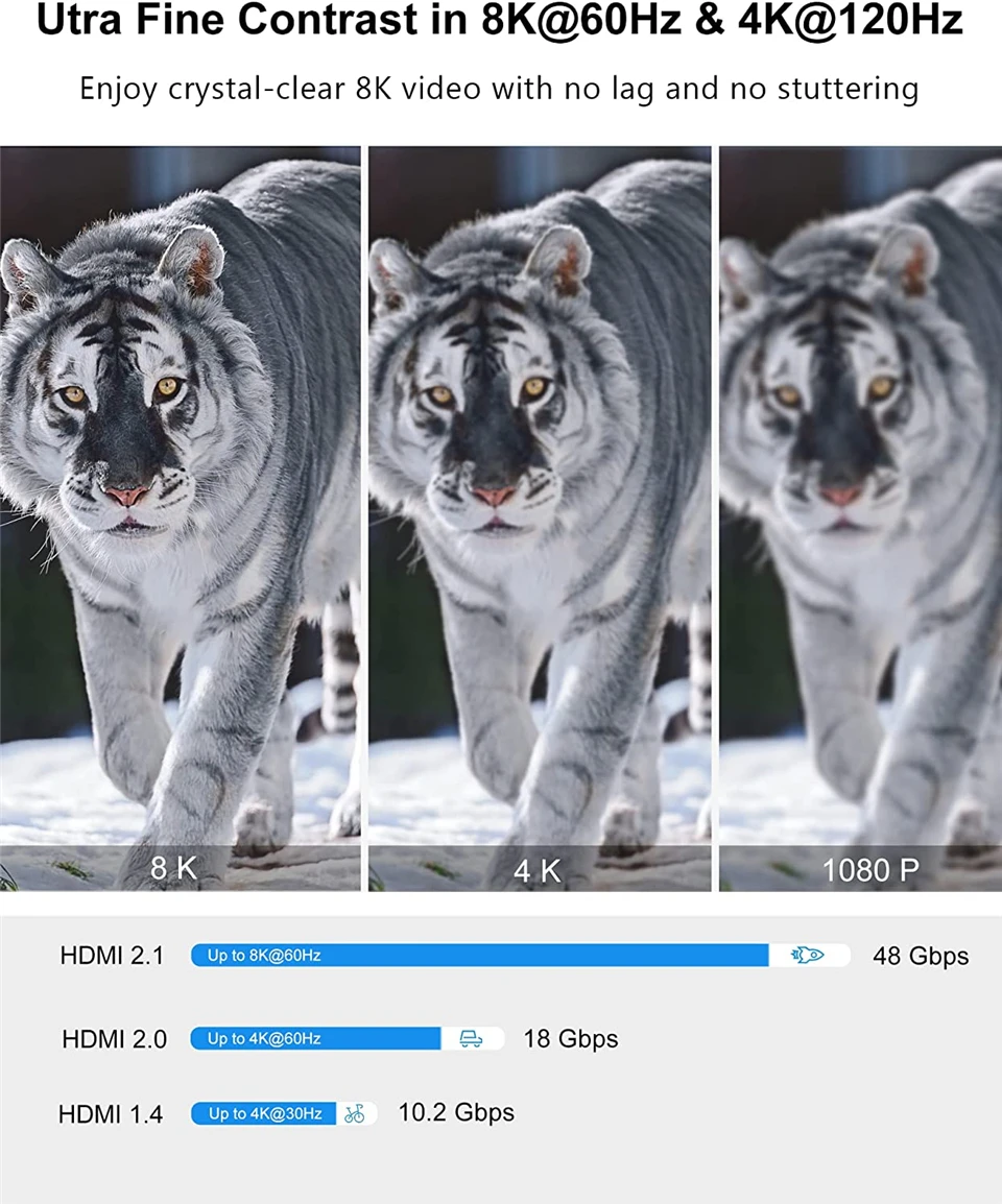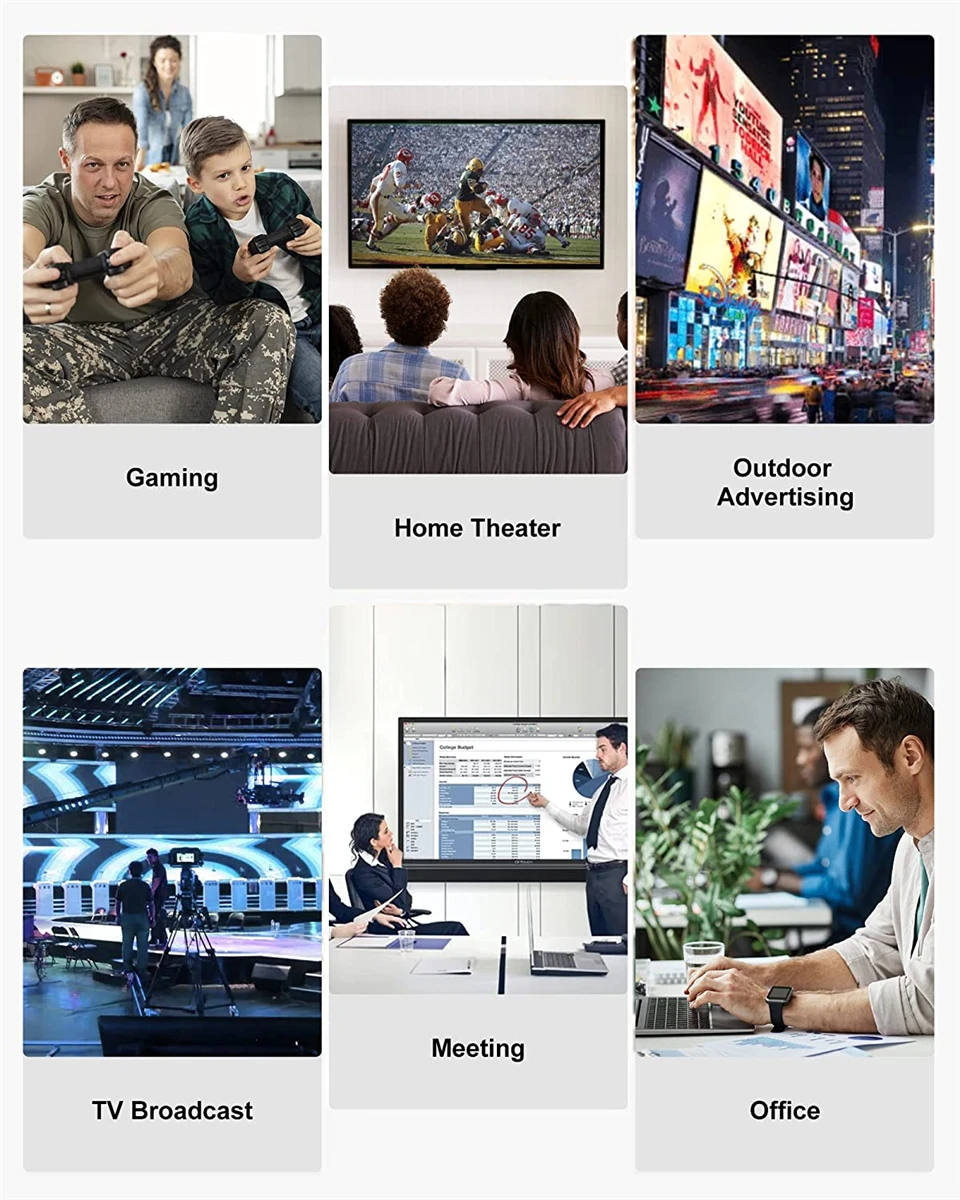 Resolución Ultra HD 8K: ya sea que su dispositivo sea 4K u 8K, puede darle la resolución que desee, nunca se preocupe por que la imagen no sea lo suficientemente clara, el dispositivo admite todas las resoluciones inferiores a 8K, proporcionando la resolución perfecta.