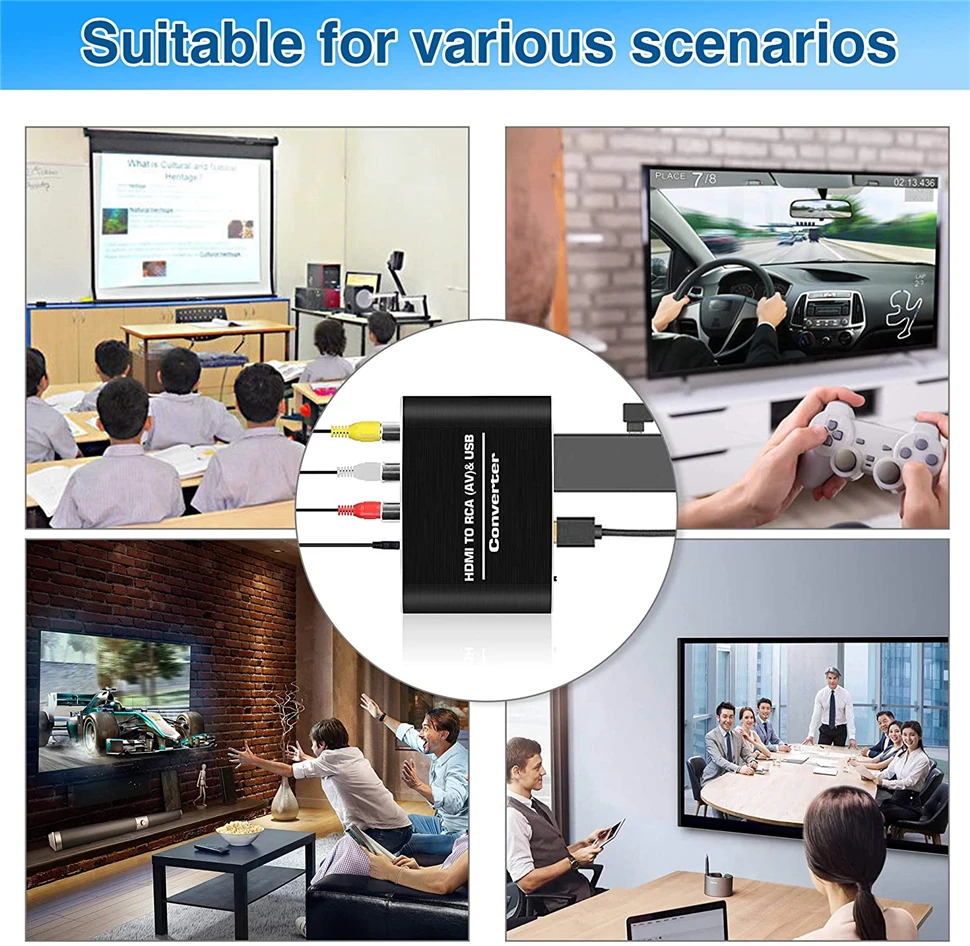Convierta la señal de vídeo HDMI en señal CVB (AV) normal (definición estándar 480i, 576i), disponible para TV Stick, Roku, Chromecast, Apple TV, PC, computadora portátil, Xbox, HDTV, DVD-negro, etc.