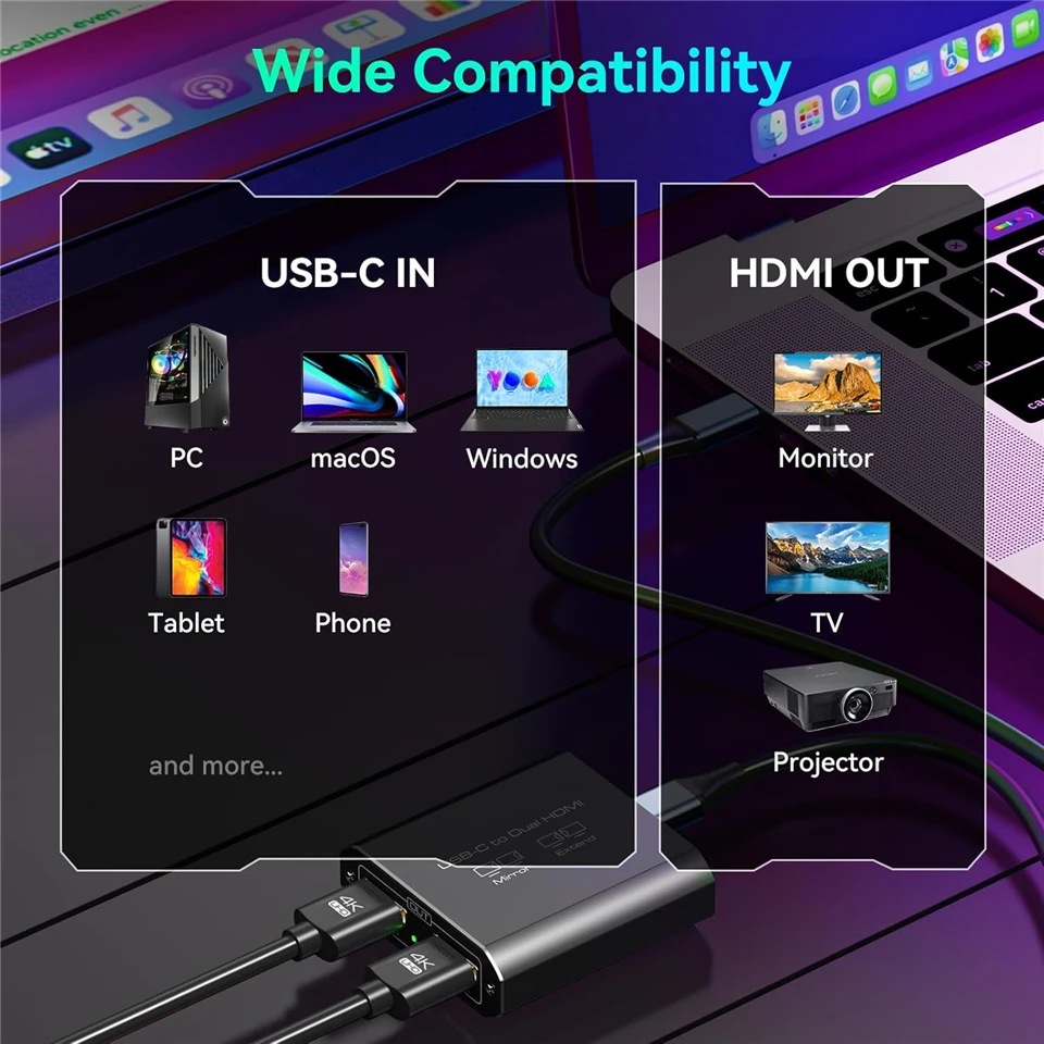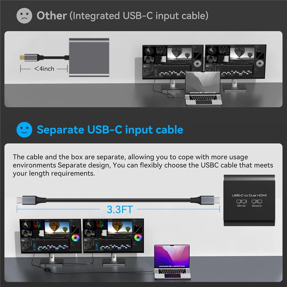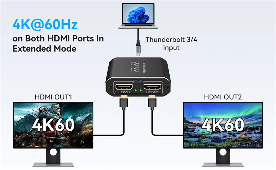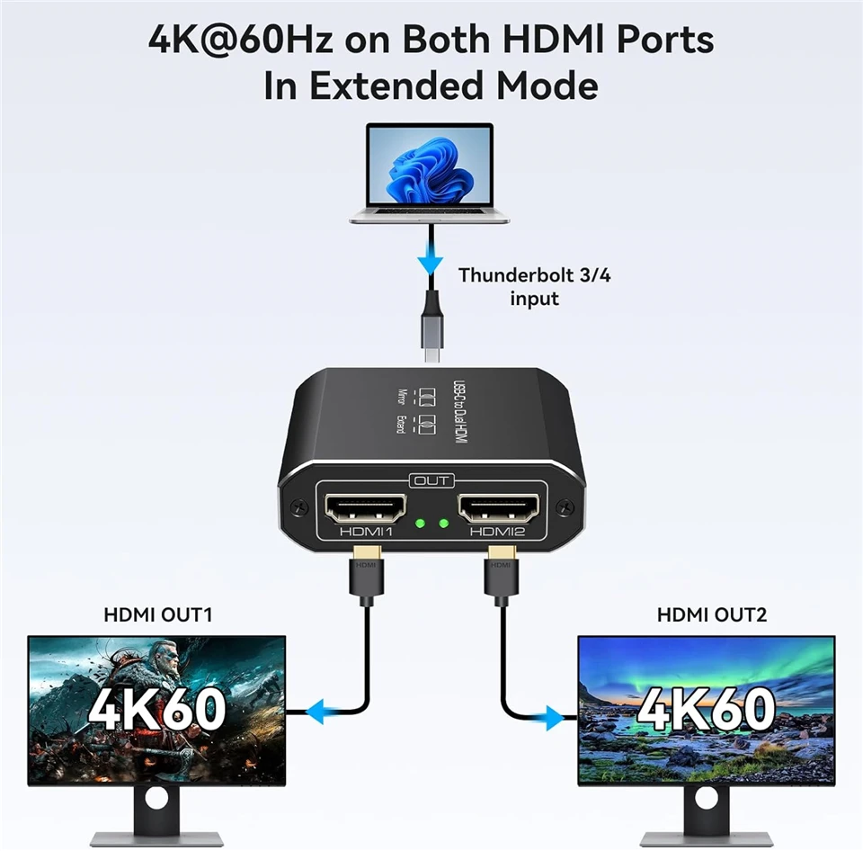 Compatibilidad con 4K a 60 Hz en ambos puertos HDMI: ambos puertos HDMI admiten 4K a 60 Hz, puede disfrutar de dos videos claros de 4K a 60 Hz simultáneamente en modos extendido y de copia sin demora ni pérdida de calidad, y es compatible con versiones anteriores de 4K a 30 Hz, 2K, 1080P, etc.Nota: asegúrese de que su fuente, cable HDMI y monitores admitan 4K@60Hz