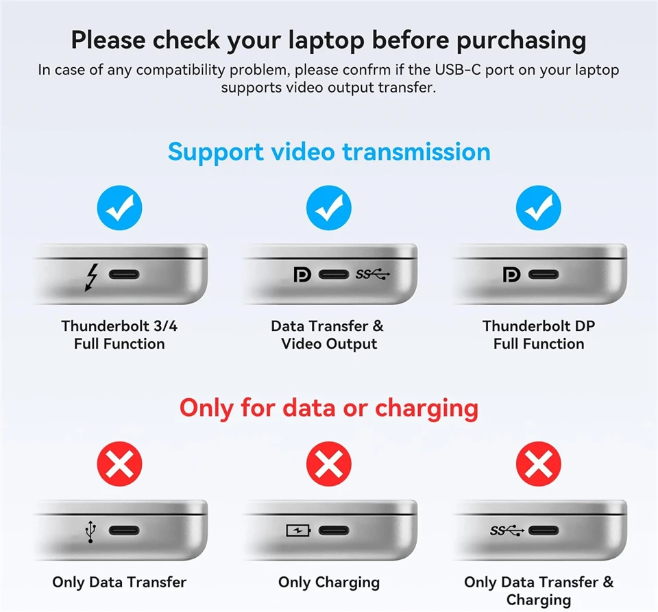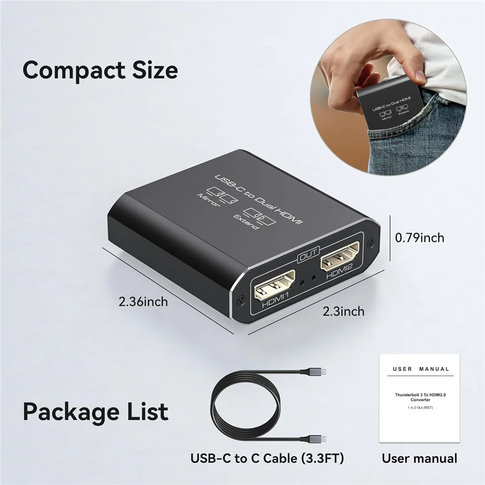 Adaptador USB C a HDMI dual: Dongle USBC a HDMI que puede conectar computadoras portátiles o macbook con puertos tipo C (Thunderbolt 3/4) a otros dos monitores con puertos HDMI para una configuración triple;Le permite realizar múltiples tareas de manera más eficiente con el inmobiliario adicional en pantalla grande.Asegúrese de que el puerto tipo c de su dispositivo admita salida de video o modo DP Alt (más detalles con tercera imagen) Nota: Si su Macbook está instalado con Windows, aún no puede admitir el modo MST
