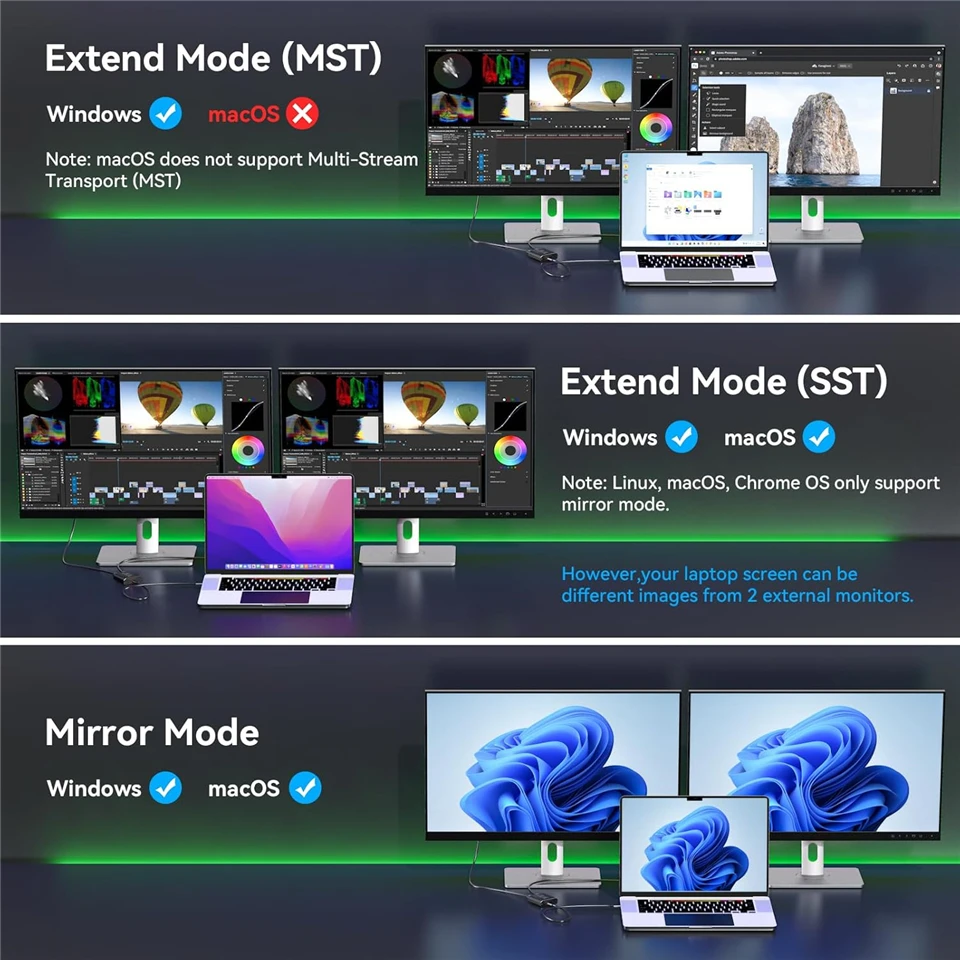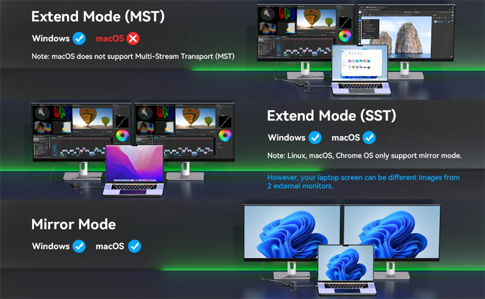 2.Mac OS solo admite el modo SST (AAA/ABB), no se recomienda conectar ninguna estación de acoplamiento o concentrador (la mayoría de las estaciones de acoplamiento y concentradores no admiten la función MST)