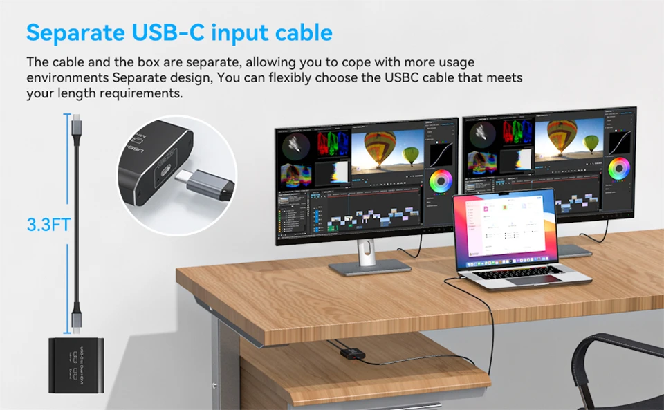 Una salida USB-C se puede dividir en dos monitores o monitores HDMl de 4K y 60 Hz.No se requiere alimentación externa.