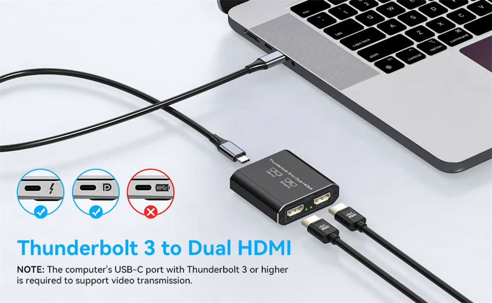 El divisor USB C a HDMI dual puede emitir 1 señal Thunderbolt 3 a 2 pantallas HDMI al mismo tiempo (Nota: no puede agregar otros dispositivos en el medio (por ejemplo,estación de acoplamiento, concentrador) o no admitirá visualización heterodina)