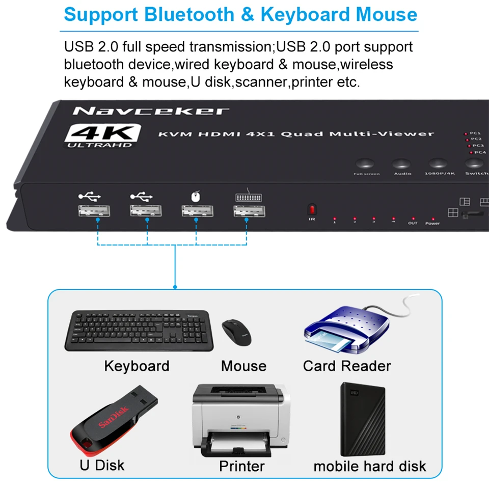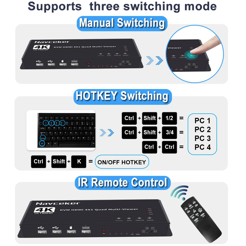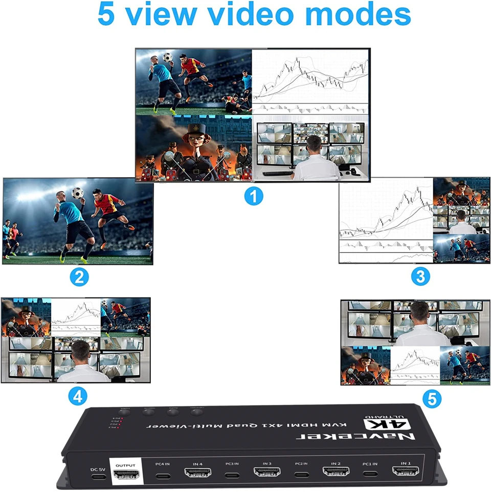 Navceker 4K HDMI 4x1 Quad KVM Multi-VIEWER es un alto rendimiento con cuatro segmentaciones de pantalla HD y un interruptor de salida de conmutación sin problemas. Puede mostrar la señal de vídeo digital 4 HD en la misma pantalla y tiene una variedad de segmentación de vídeo, cambiando sin interrupciones la señal de entrada 4 HD de forma sincrónica. Los métodos de control del interruptor son flexibles, se pueden cambiar a través del botón, control IR y control KVM. Es un interruptor muy práctico y estable y fácil de instalar, se puede utilizar en los principales proyectos, salas de reuniones y otros lugares.