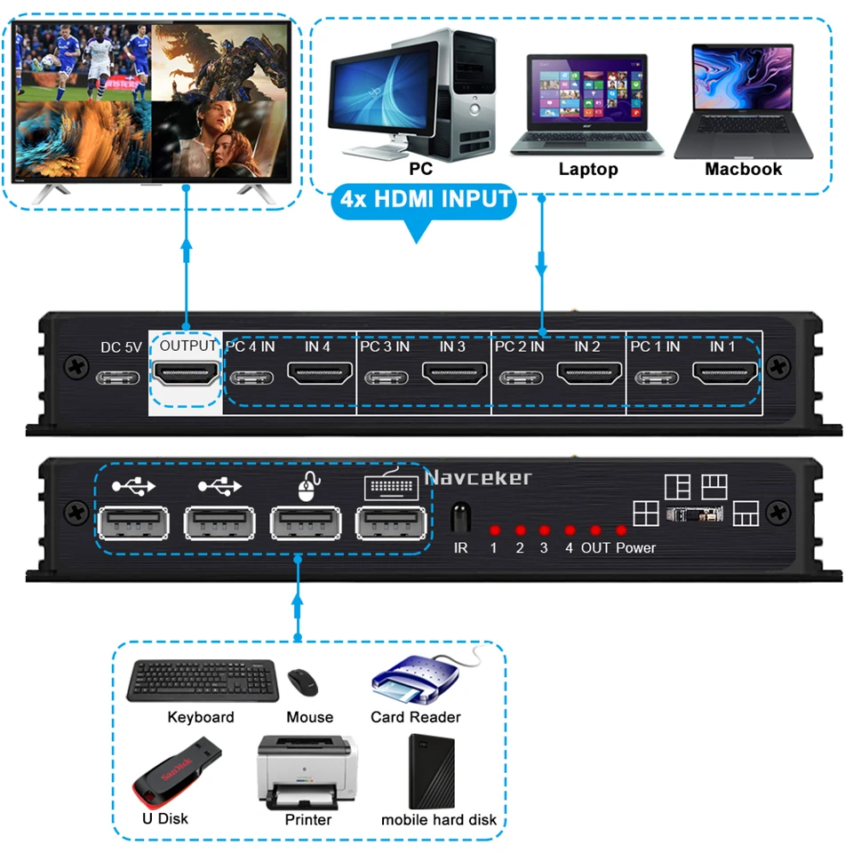 Comprar Navceker KVM-multivisor 4K 4 en 1, conmutador sin soldadura con IR, compatible con HDMI, 1080P, pantalla cuádruple