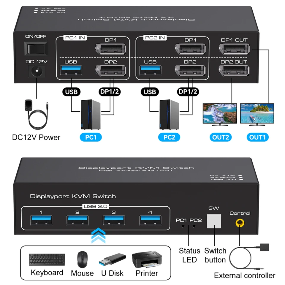 2 In 2 Out 4K 120Hz USB 3,0 HDMI Displayport KVM Switch Box Monitor dual para 2 PC Sharing Keyboard Mouse Printer Plug Play Video 2 Display USB Switch Splitter