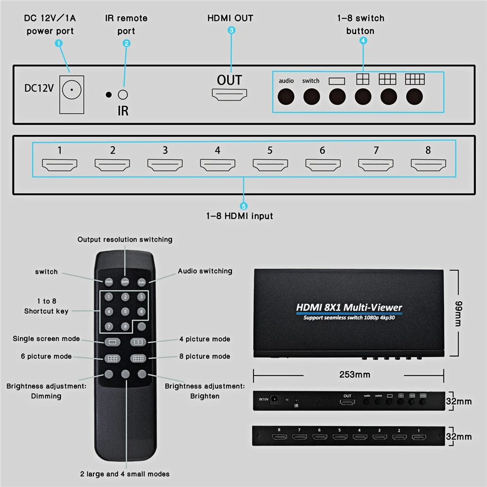 Control remoto y control de botones: 8x1 Quad Multi-Viewer con botones de función y control remoto IR adjunto. El botón manual y el control remoto admiten el cambio de fuente de entrada, la selección del modo de pantalla completa o los modos cuádruples y el audio de la fuente de entrada;