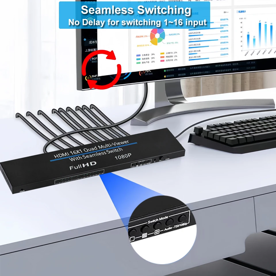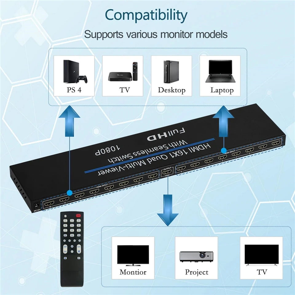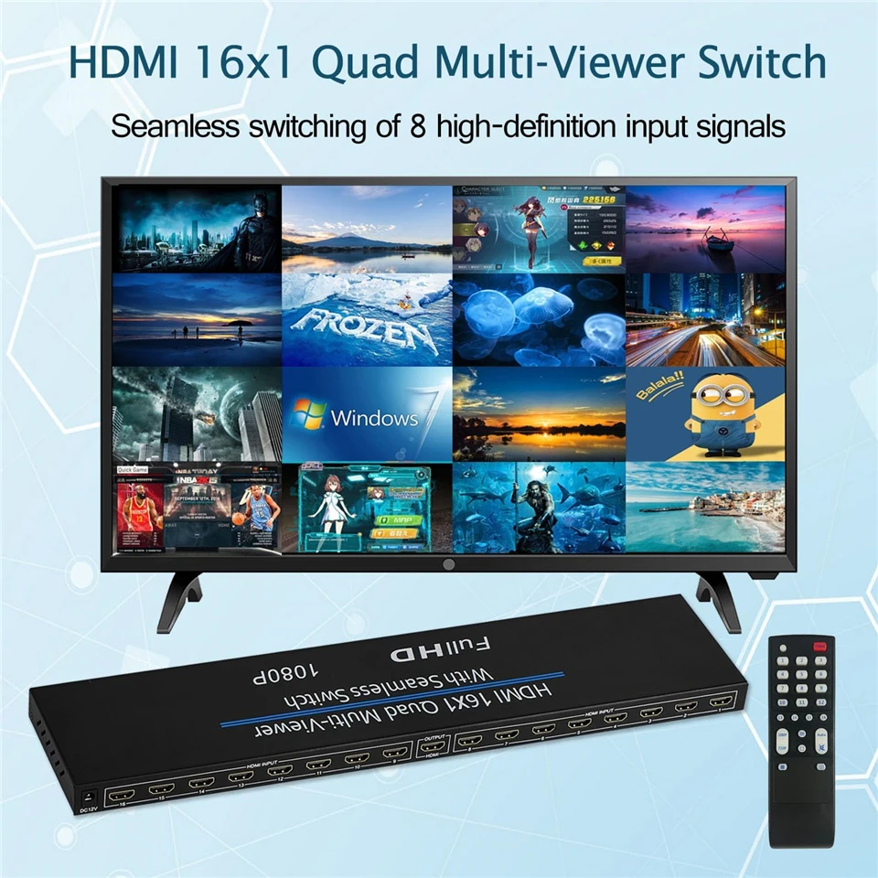 HDMI 16x1 Multi-VIEWER Switcher Seamless Quad Screen en tiempo real Multi Viewer Splitter 16 en 1 out HDMI Switch Adapter con IR