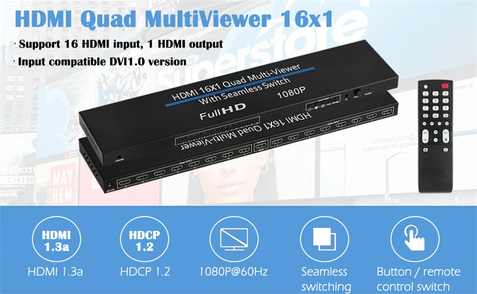 Navceker 1080P HDMI 16x1 Quad Multi-VIEWER es un alto rendimiento con segmentación de pantalla de 16 HD e interruptor de salida de conmutación sin interrupciones. Puede mostrar 16 señales de vídeo digital HD en la misma pantalla y tiene una variedad de segmentación de vídeo, cambiando sin interrupciones 16 señales de entrada HD de forma sincrónica.