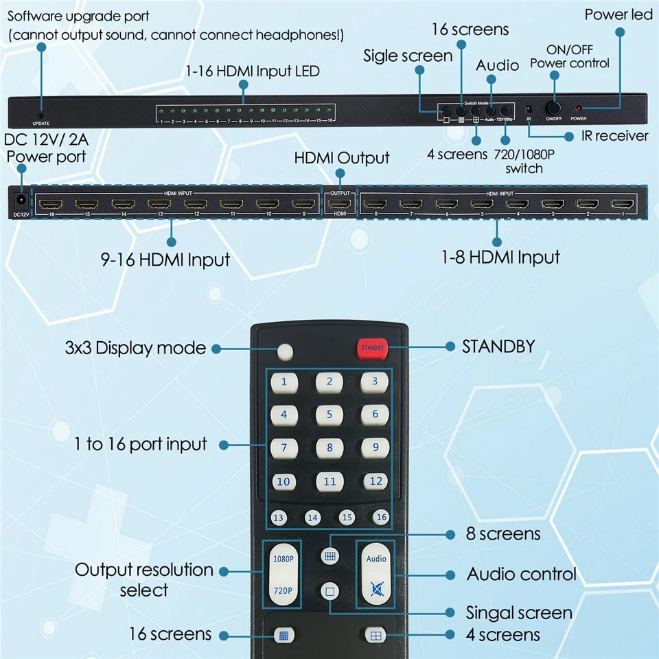 📂Soporta 16 entradas HDMI, 1 salida HDMI;