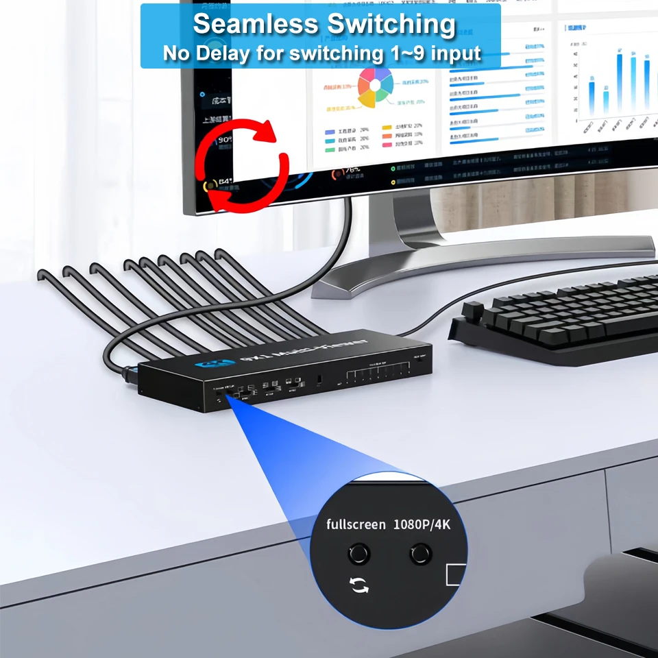 📂Sin retraso para cambiar 1 ~ 9 entrada HDMI con imagen perfecta.