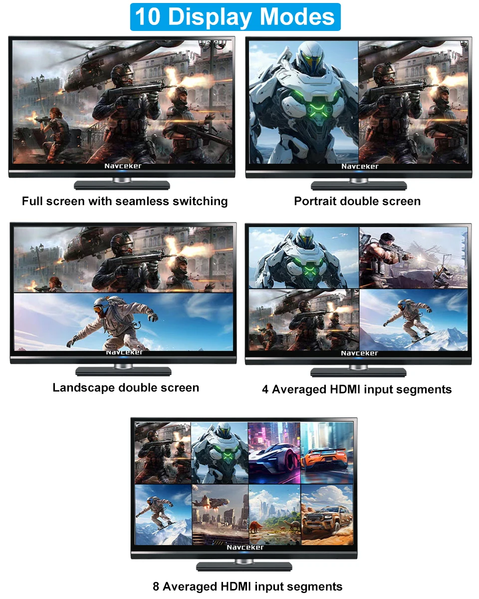 Pantalla de visualización de 10 formas: El selector multivista cuádruple Navceker 9X1 admite 10 modos de visualización. Puede ver la pantalla de 9 fuentes de entrada HDMI en un monitor de 10 formas, también solo puede ver una fuente de entrada HDMI por pantalla completa;
