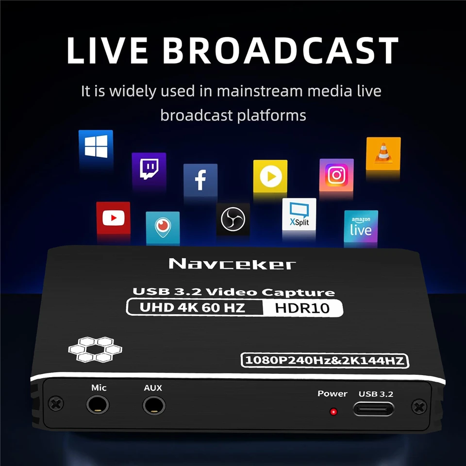 Navceker-Tarjetas de captura de vídeo USB 3,2 HDMI, HDMI a USB 3,2, 4K, 60fps, 2K, 144fps, 1080P @ 240fps, grabación a través de videocámara DSLR, cámara de acción a PC o Mac