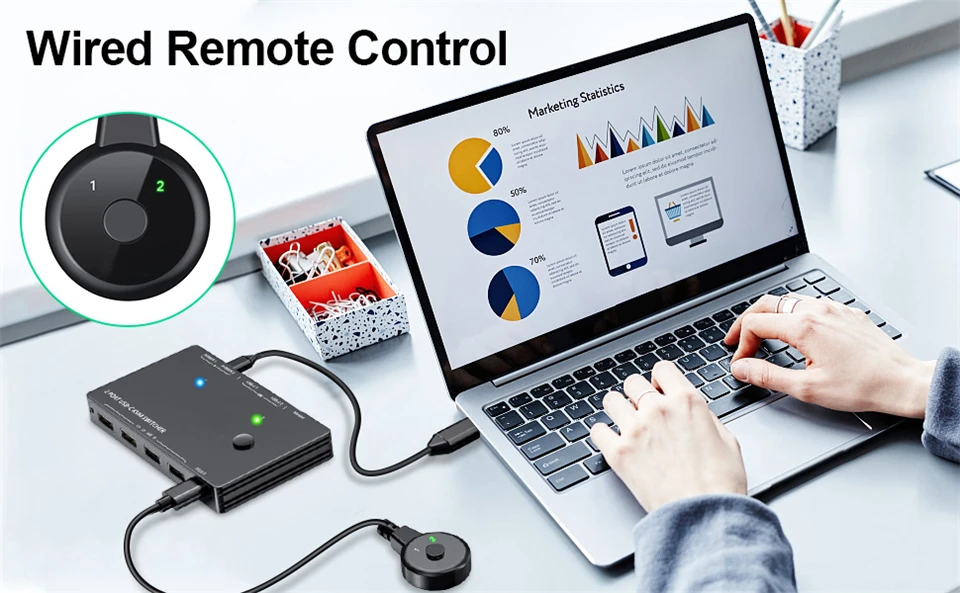 Salida de interruptor KVM USB tipo C HDMI 2,0 con resolución de hasta 4k @ 60Hz, 2K @ 120Hz, 1440P @ 100Hz, retrocompatible con resoluciones más bajas.