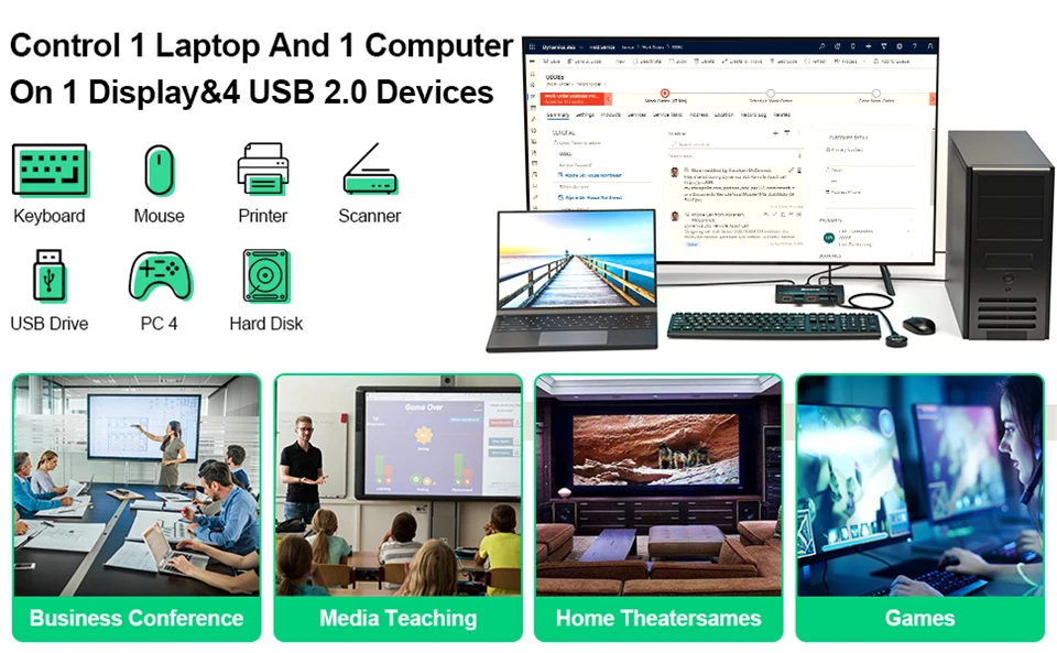 【Buena compatibilidad】Plug and play, compatible con ordenadores portátiles u ordenadores con puerto y HDMI. Este nuevo interruptor KVM le ayuda a simplificar su trabajo y mejorar la eficiencia. Los escenarios comunes incluyen oficinas en casa, pequeñas empresas, salas de ordenadores, salas de servidores, etc.