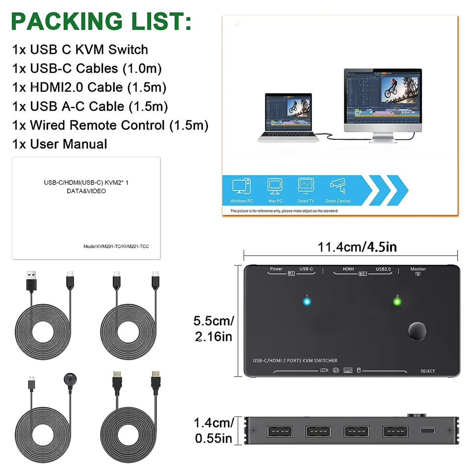 Este conmutador KVM HDMI tipo C admite la conexión de 1 ordenador portátil con un puerto y 1 PC con puerto HDMI para compartir 1 Monitor HD y 4 Dispositivos USB 2,0