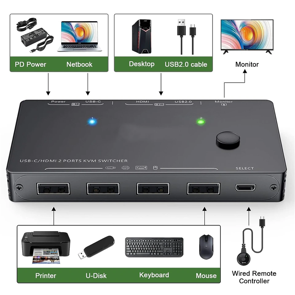 Navceker-Conmutador KVM 4K, 4K USB C + HDMI, le permite compartir un teclado USB, ratón USB, 2 dispositivos USB 2,0 y un monitor HDMI para controlar 2 Macbook, ordenadores, portátiles, consolas de juegos.