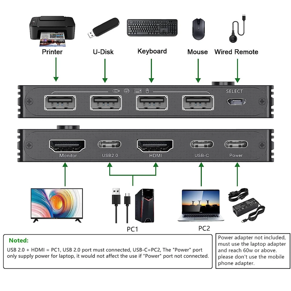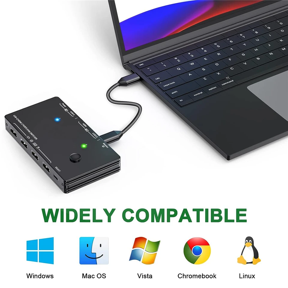 Este conmutador KVM HDMI tipo C admite la conexión de 1 ordenador portátil con un puerto y 1 PC con puerto HDMI para compartir 1 Monitor HD y 4 Dispositivos USB 2,0