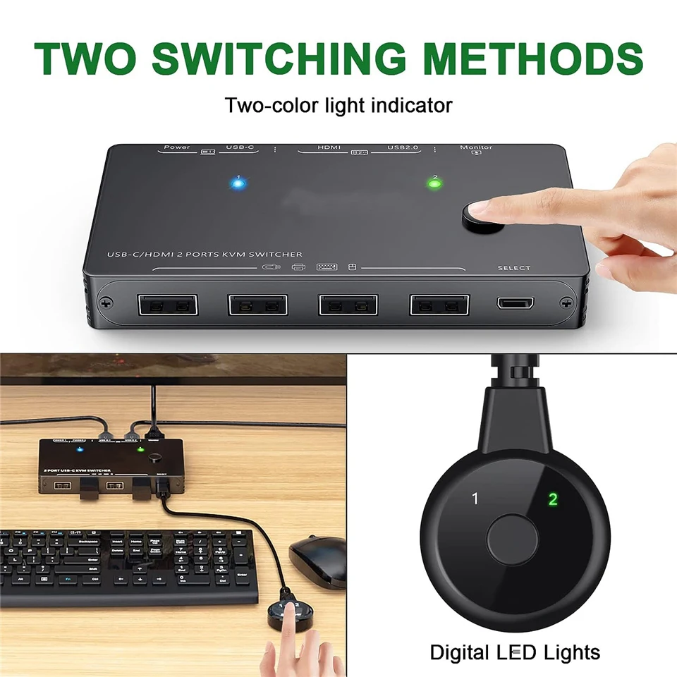 Navceker-Conmutador KVM 4K, 4K USB C + HDMI, le permite compartir un teclado USB, ratón USB, 2 dispositivos USB 2,0 y un monitor HDMI para controlar 2 Macbook, ordenadores, portátiles, consolas de juegos.