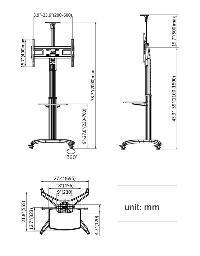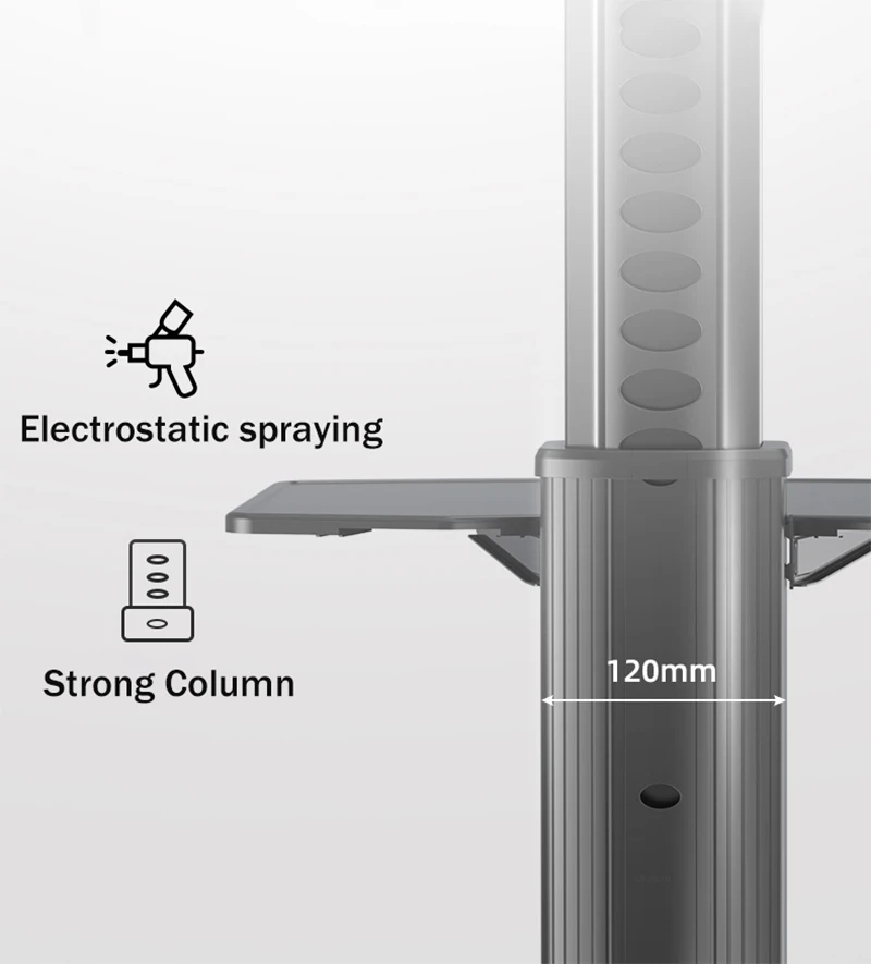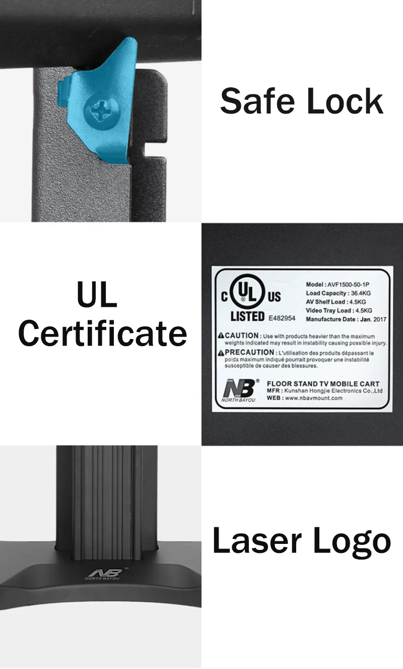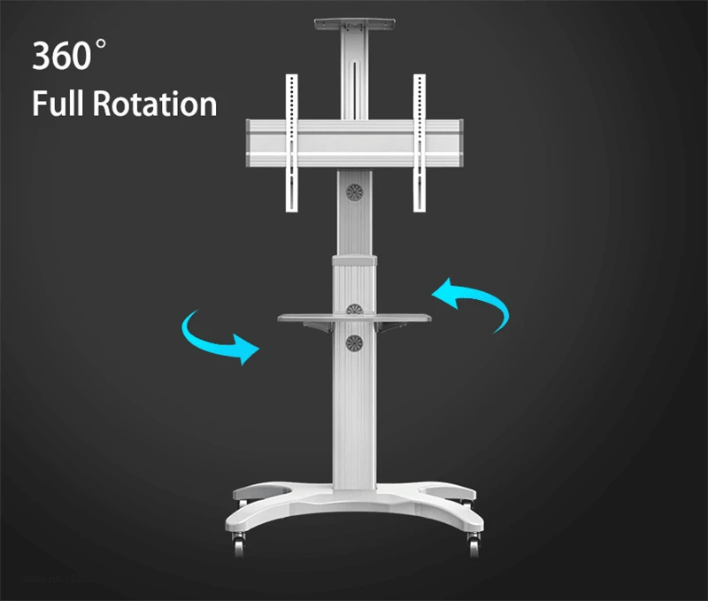 Viene con bandeja de cámara estándar y estante AV de accesorios, diseñado con una construcción de base de contorno de aluminio grande y rígido para proporcionar un buen equilibrio y un buen peso de soporte necesario para garantizar la estabilidad; ajuste de altura del televisor liberando tornillos en ambos lados; gestión de cable integrada en la columna interior; transportado hasta 80 lbs (36,4 kg) Y TV de pantalla plana de 32 "a 65" con 4 ruedas de frenado de alta resistencia que ofrecen una fácil movilidad o posiciones estáticas en el sitio.