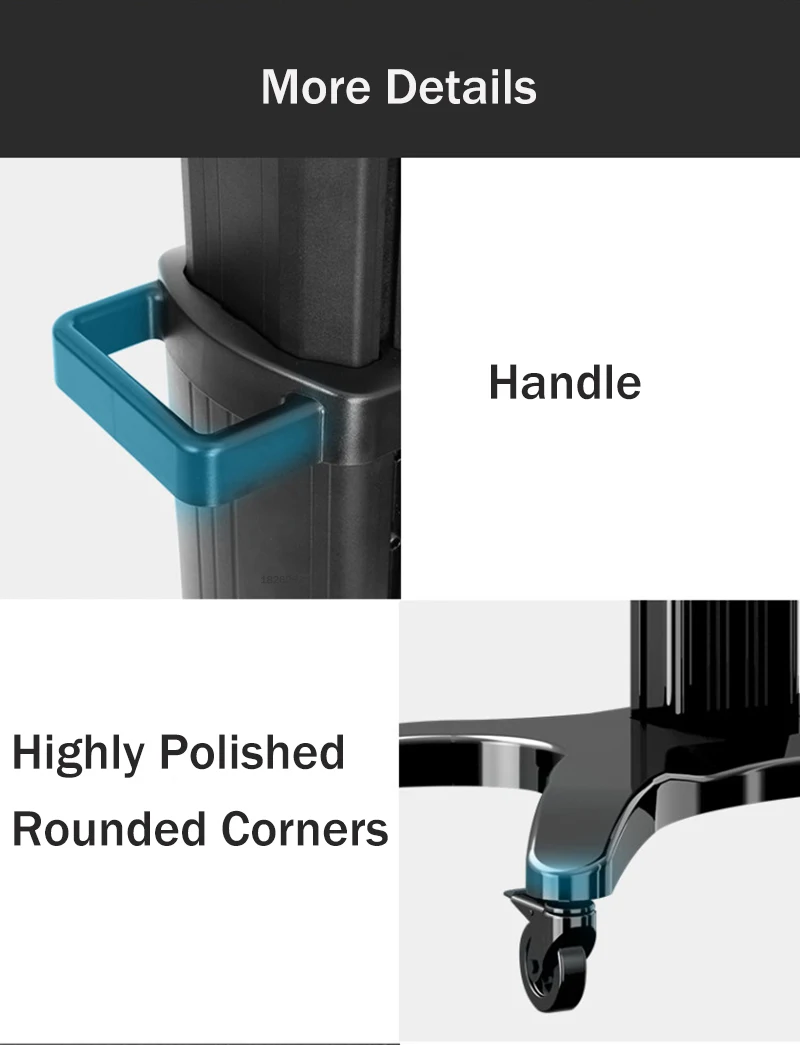 Diseñado en muy pulido Sin bordes afilados, proporciona una unidad de visualización móvil segura y Evita poner en peligro accidentes a los usuarios. Los bloques modulares diseñados hacen que este soporte sea rápido y fácil de montar y desmontar.