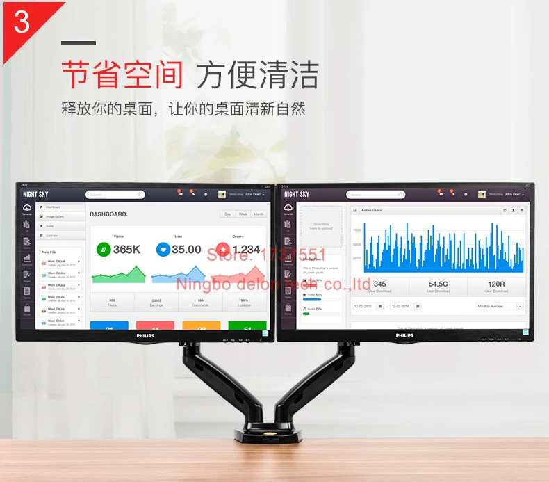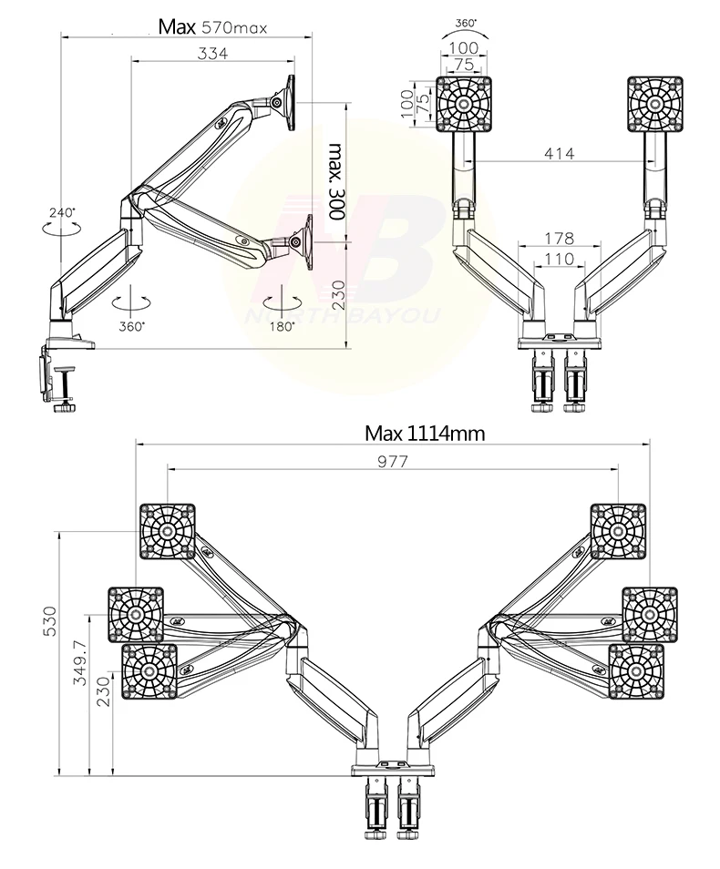 - Brazos giratorios de 360 ° y rotación de interfaz de 360 ° con ángulo de inclinación antideslumbrante
