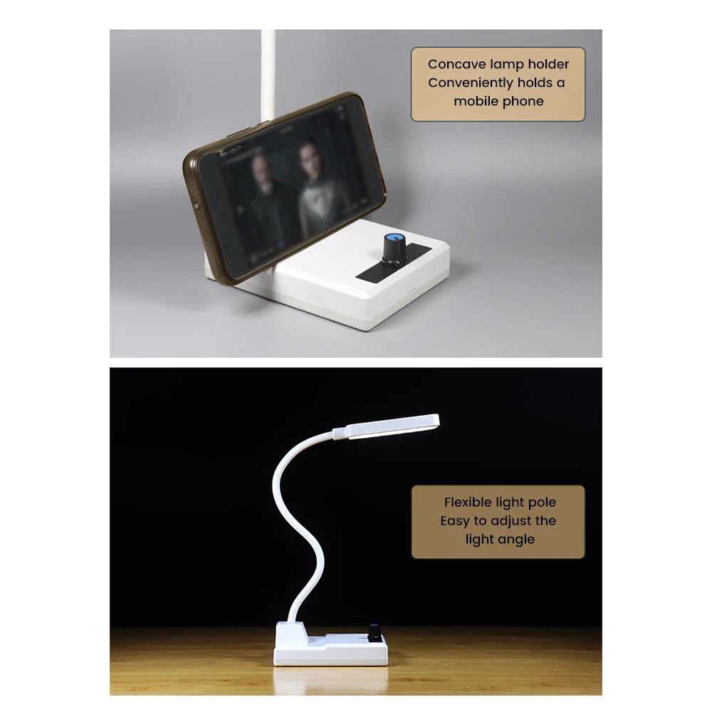 3.El producto terminado es muy útil: el brillo se puede ajustar, la lámpara flexible es flexible y ajustable, la lámpara de escritorio permite apuntar la luz en cualquier dirección, también se puede utilizar como soporte para teléfono móvil.