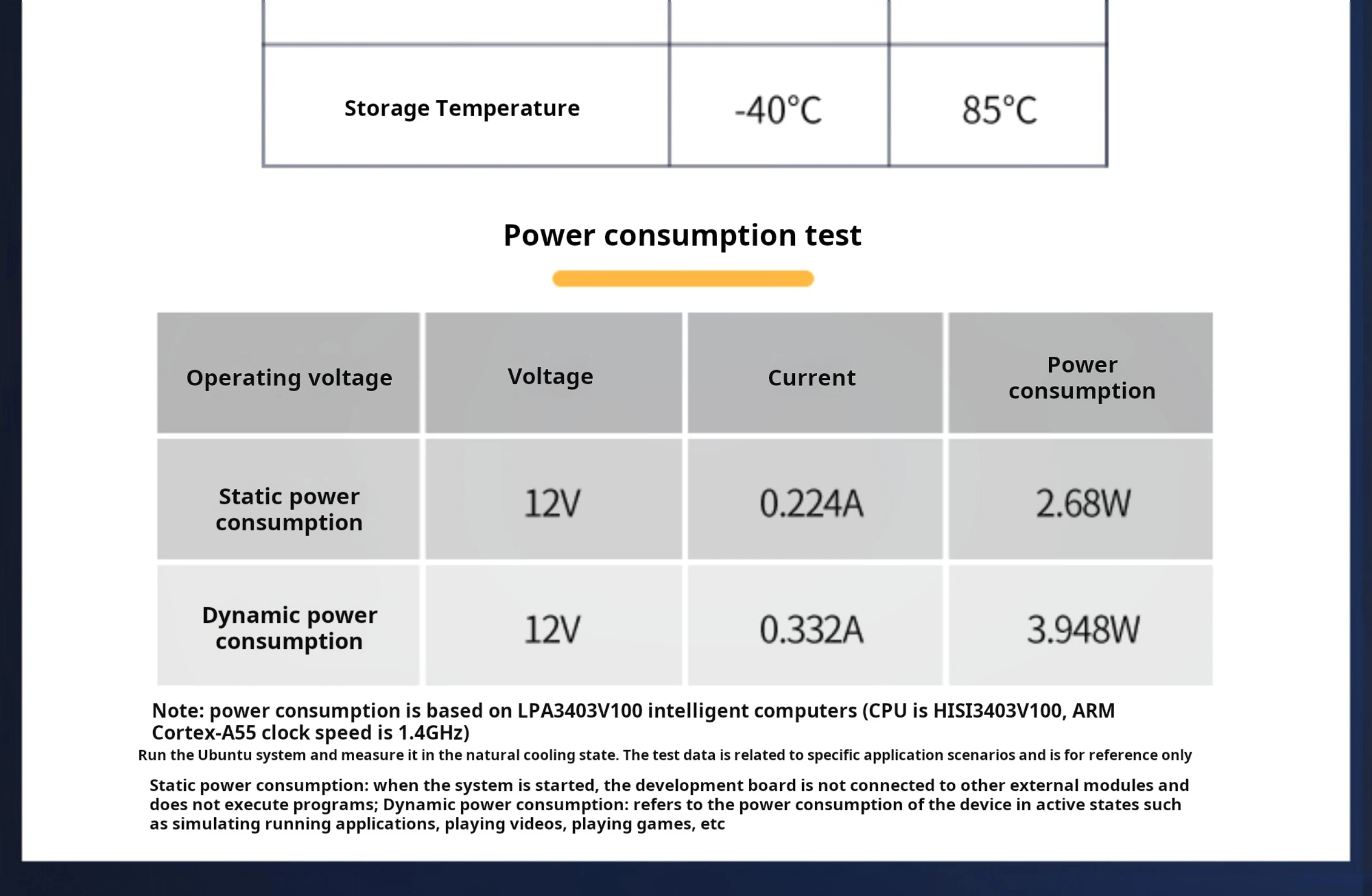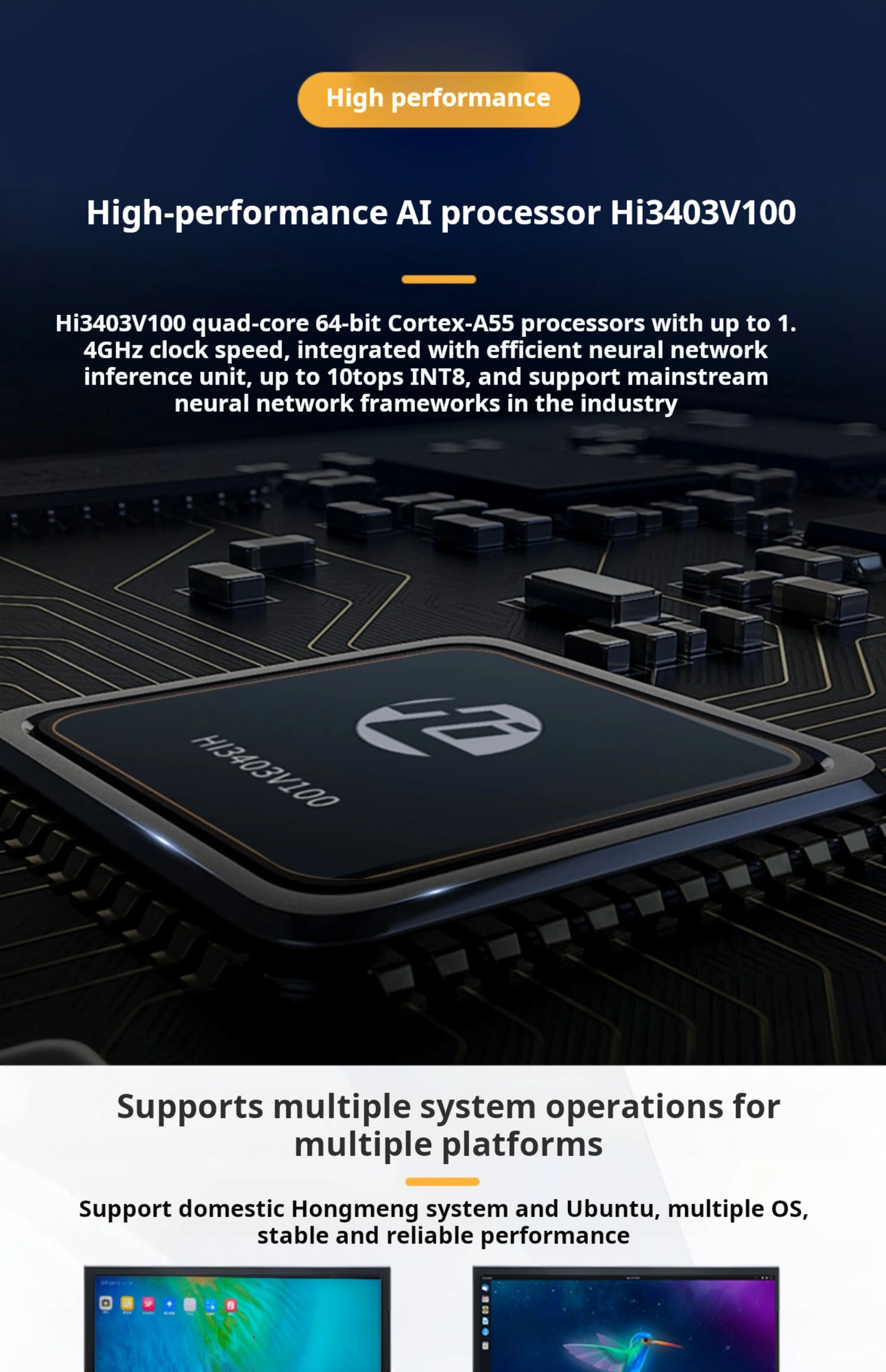 Parámetros básicosSOCHi3403V100;4Procesador de arquitectura Nuclear64Slot (4*A55 1,4GHz)NPU10.4TOPS@INT8 Isomorphismo de doble núcleoVPUSoporteH264/H265/MPEG-44K60fps +1080P60fpCompatible con H264/H265 4k60fps+720P30fps 8K15fpsDDRLPDDR4/4X, opcional4GB/8GBeMMCeMMC 5.1, opcional 32GB/64GBSOLinuxLos parámetros de hardwarePotenciaDC12V - 3A (conector oblea DC Jack 5,5*2,1 mm / PH2.0)USBMostrar1*HDMI 2.0 tipo A hasta4K@60fps(Diferentes versiones del sistema tienen diferentes especificaciones)AudioTrabajo neto1* Ethernet de 10/100/1000MbpsTarjeta SDCompatible con el protocolo SDIO 3.0, compatible con arranque del sistemaPuerto serie3 * Uart, RS485Otros parámetrosTamañoL*ancho*alto (mm)195*104*36TemperaturaTemperatura de trabajo -10 - 70PesoAproximadamente 570 g (sin incluir periféricos)Consumo de energía estática2,68 W (el sistema arranca, la placa de desarrollo no está conectada a otros módulos externos y no se ejecuta ningún programa)Consumo de energía dinámico3,95 W (se refiere al consumo de energía del dispositivo en estados activos como la simulación de aplicaciones en ejecución, la reproducción de videos y los juegos)