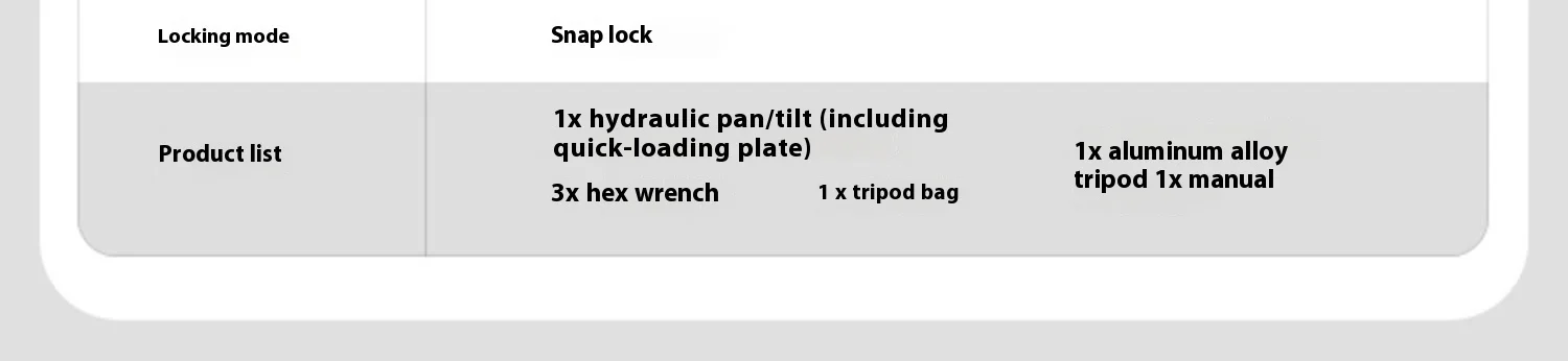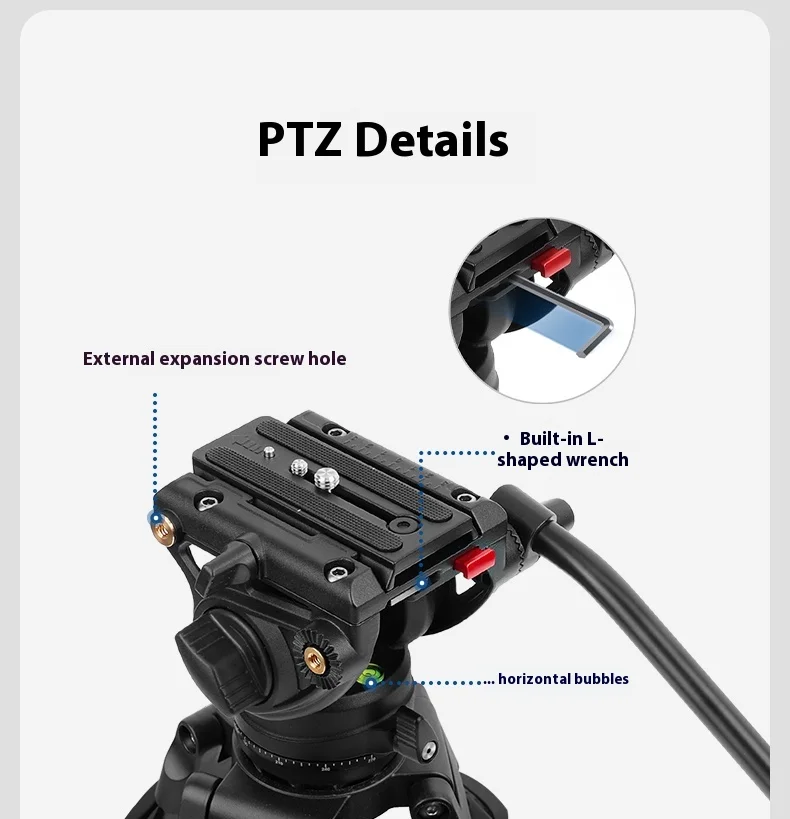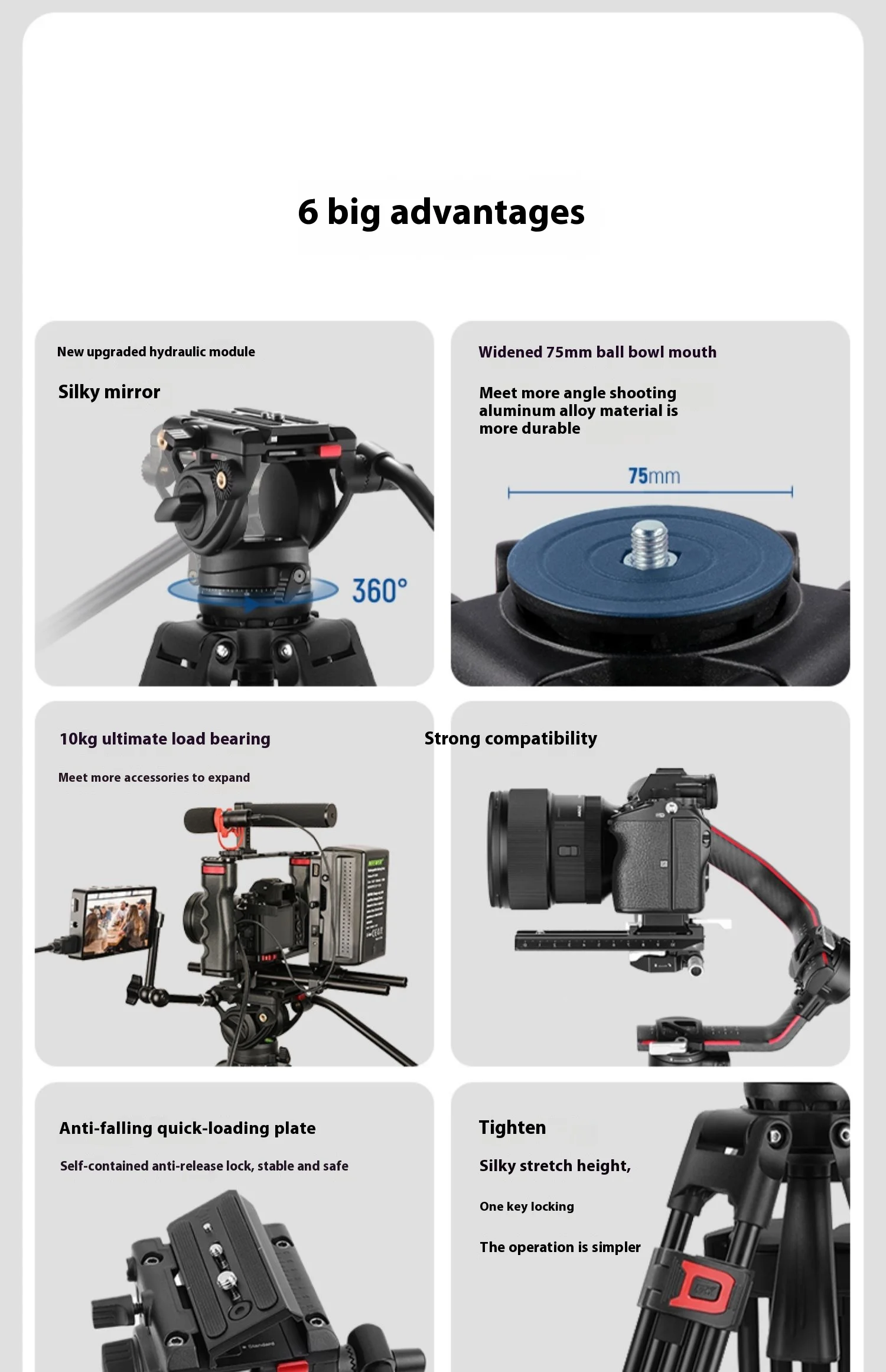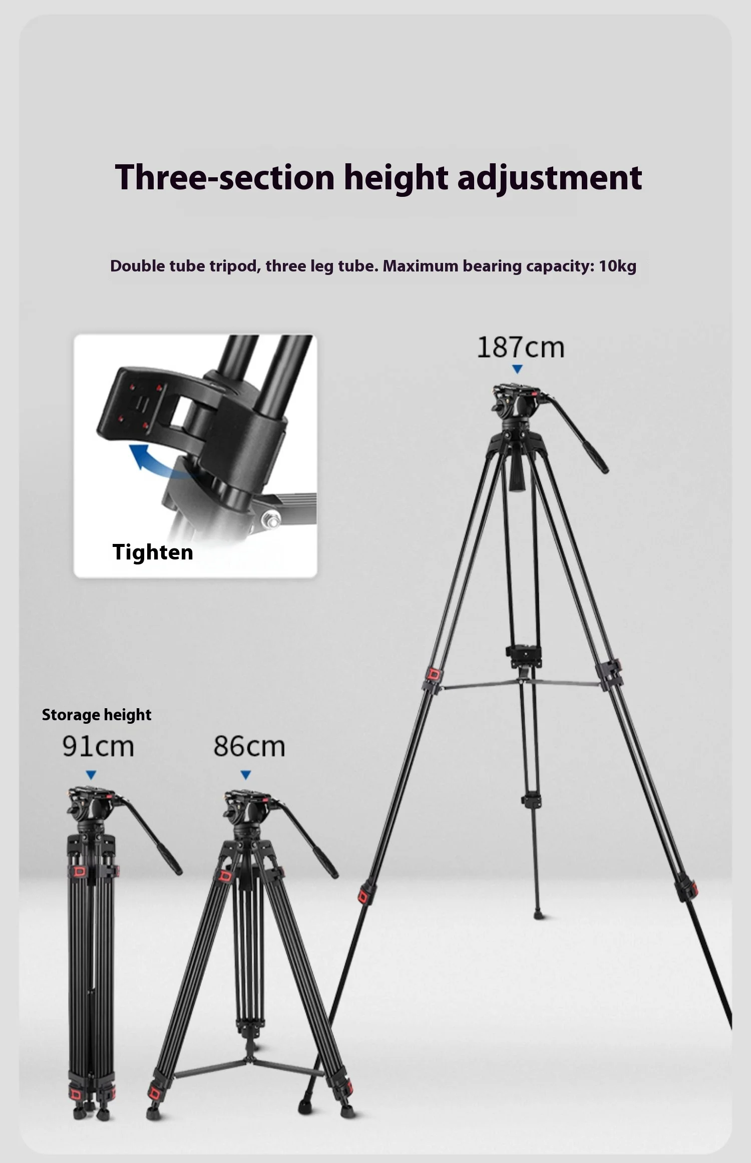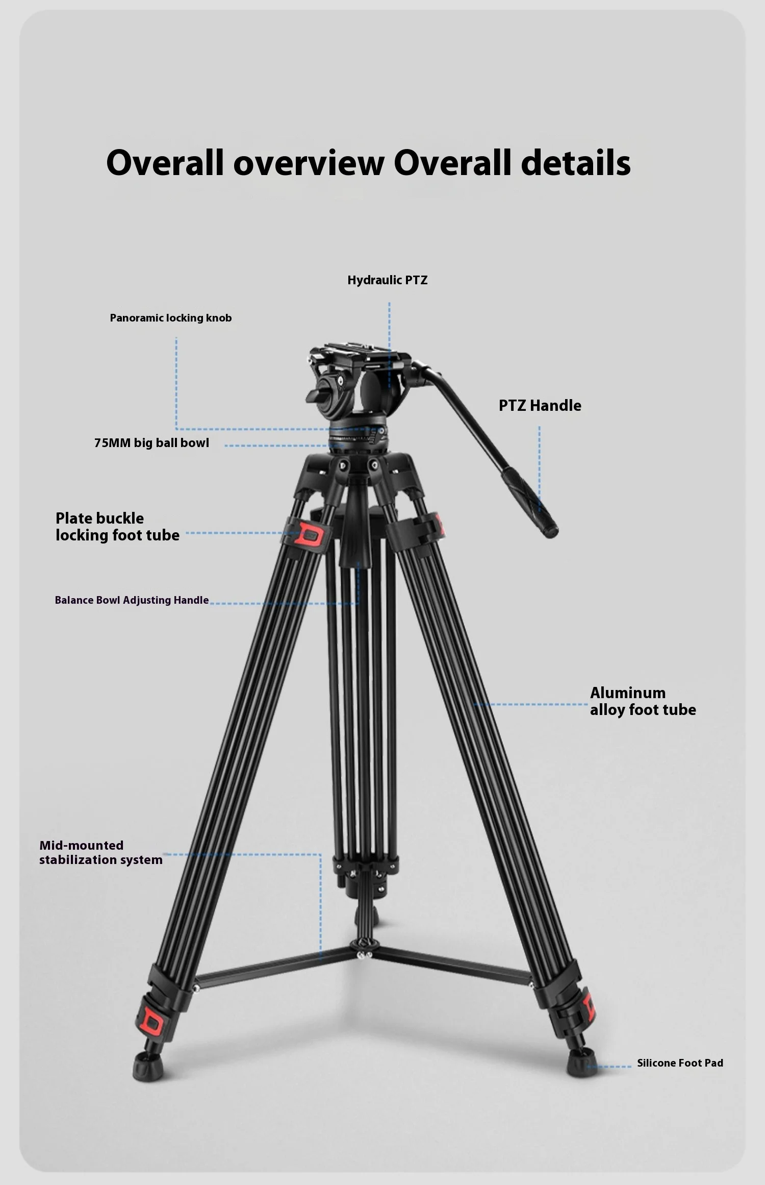 NEEWER TP74 Trípode resistente cardán hidráulico 360° movimiento de espejo aleación de aluminio trípode profesional personalizadoModelo de producto: TP74 Material: aleación de aluminio Capacidad máxima de carga: 10 kg Rango de altura de exposición: 86cm-187cm Altura de almacenamiento: 91 cm Ángulo de disparo vertical: -70° a 90° Ángulo de rotación horizontal: 360° Tipo de cardán: cardán hidráulico Número de secciones del tubo del pie: 3 Peso del producto: 4 kg Diámetro del cuenco: 75 mm Método de bloqueo: encaje en bloqueo rápido