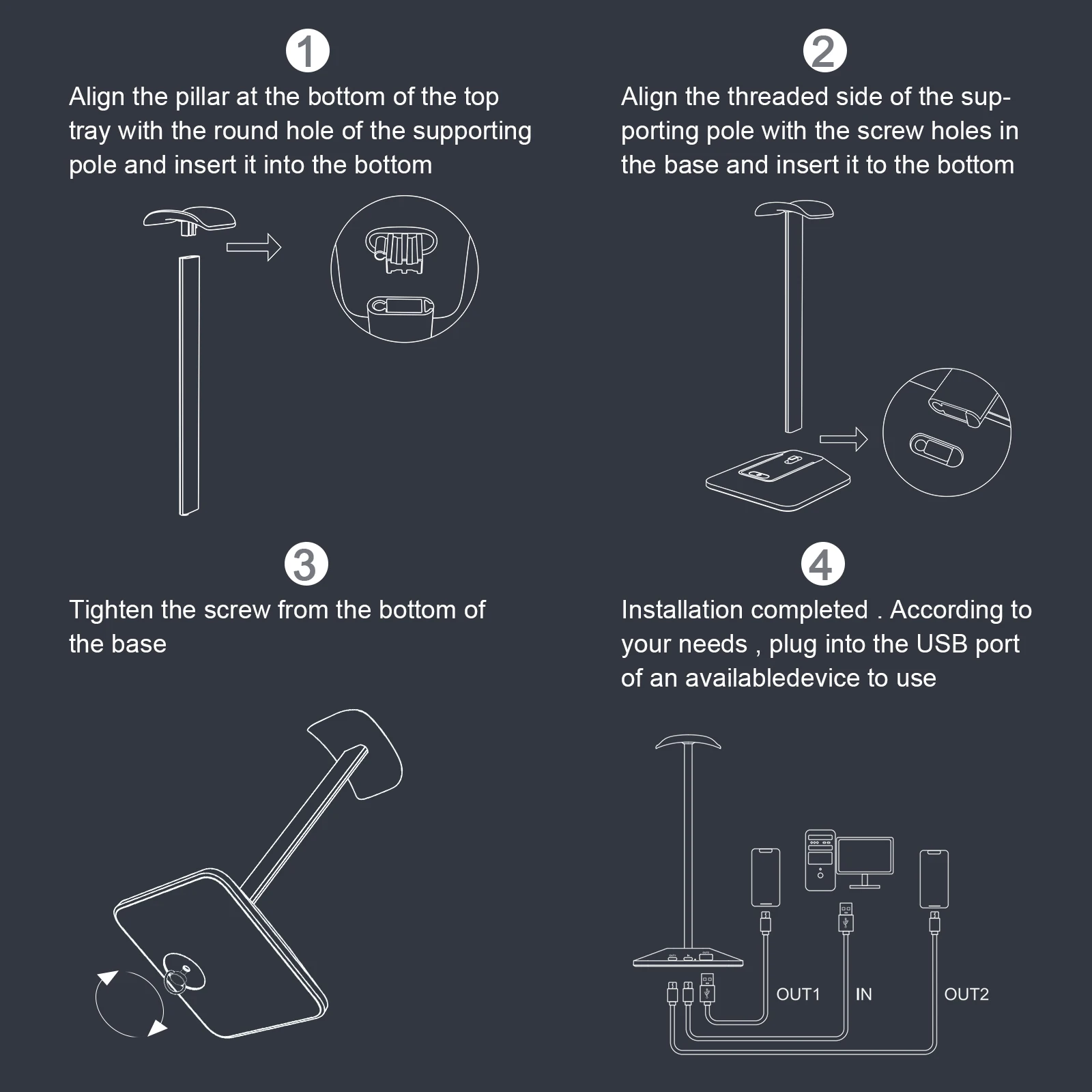 Paso 3: Inserte el poste en la parte inferior de la bandeja superior hacia la parte inferior alineando el lado del orificio redondo de la barra de soporte.