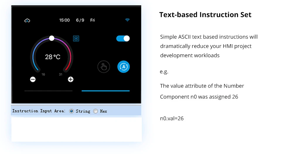 Las sencillas instrucciones basadas en texto de ASCII reducirán drásticamente las cargas de trabajo de desarrollo de su proyecto HMI.