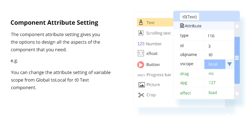 La configuración del atributo del componente le brinda las opciones para diseñar todos los aspectos del componente que necesita.