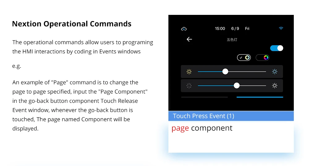 Los comandos operativos permiten a los usuarios programar las interacciones del HMI codificando en la ventana de eventos.