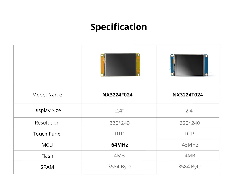 La velocidad del reloj MCU Nextion Discovery Series es de 64 MHz, que es más potente que la Serie Básica.Hay opciones de tamaño de pantalla HMI de 2,4", 2,8", 3,5" para su elección.