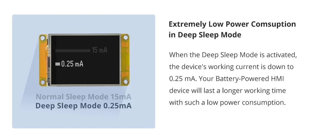 Cuando se activa el modo de suspensión profunda, la corriente de funcionamiento del dispositivo se reduce a 025 mA.Su dispositivo HMI alimentado por batería durará más tiempo de trabajo con un consumo de energía tan bajo.