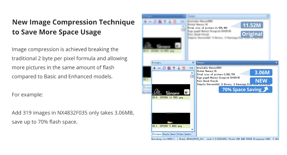 Se logra que la compresión de imágenes rompe la fórmula tradicional de 2 bytes por píxel y permite que más imágenes en la misma cantidad de flash en comparación con los modelos básicos y mejorados.