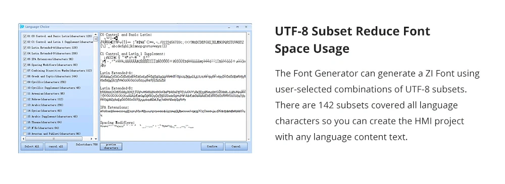 El generador de fuentes puede generar una fuente ZI utilizando combinaciones de subconjuntos UTF-8.Hay 142 subconjuntos que cubren todos los caracteres idiomas para que puedas crear el proyecto HMI con cualquier texto de contenido de idioma.