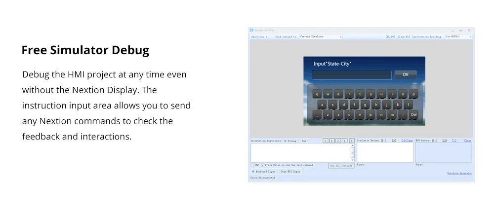 Depure el proyecto HMI en cualquier momento, incluso sin Nextion Display.El área de entrada de instrucciones le permite enviar cualquier comando de Nextion para verificar los comentarios y las interacciones.