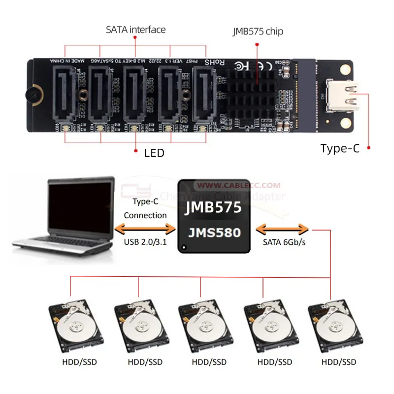 JMB575 es una solución de un solo chip.Integró 5 canales SATA independientes y un microprocesador.SAdmite el modo en cascada que permite un máximo de 5 unidades conectadas a un host.