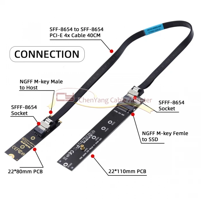 El producto incluye dos PCBA y un cable. El cable es de 40cm de longitud y se incluye un conector de la SFF-8654.