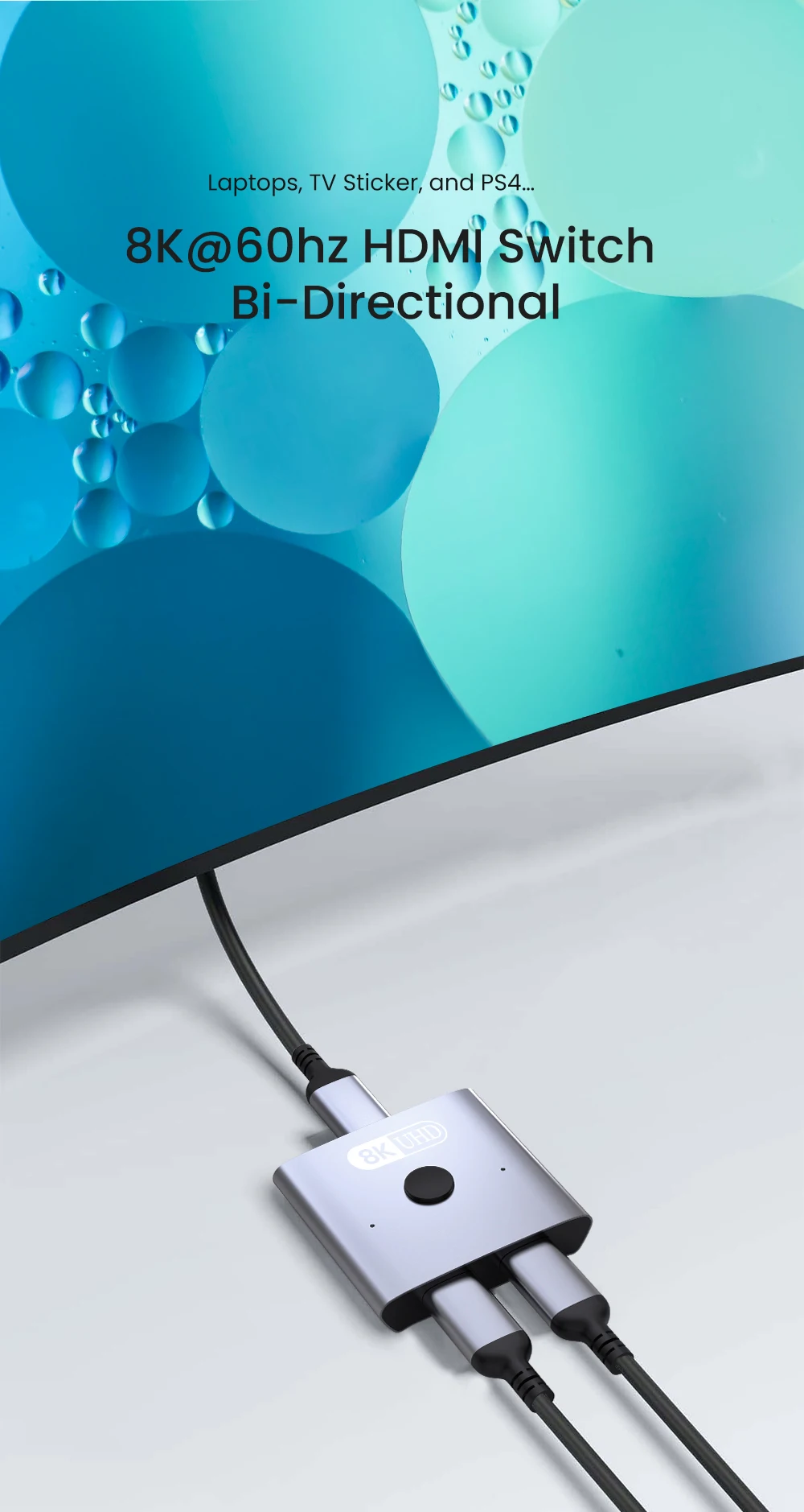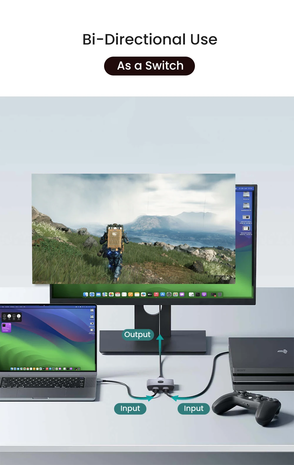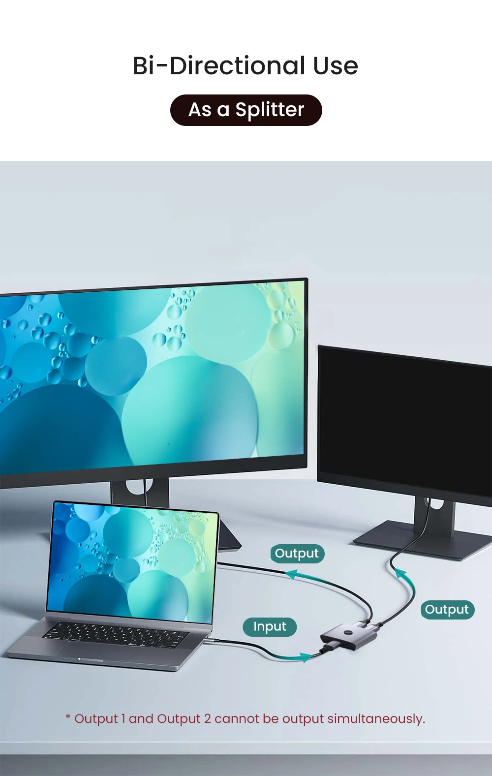 Este HDMI 2.1 conmutador bidireccional conecta sin problemas 2 fuentes HDMI a 1 pantalla HDMI (2 entradas y 1 salida), o permite que 1 fuente de señal cambie entre 2 pantallas (1 entrada y 2 salidas), entendiendo que ambas pantallas no pueden funcionar simultáneamente.Es una solución ideal para ampliar los puertos HDMI 2.1 de su televisor, proporcionando una calidad sin demoras y sin pérdidas.Cambie fácilmente entre fuentes de señal con solo presionar un botón, eliminando la necesidad de enchufar y desenchufar el cable con frecuencia.