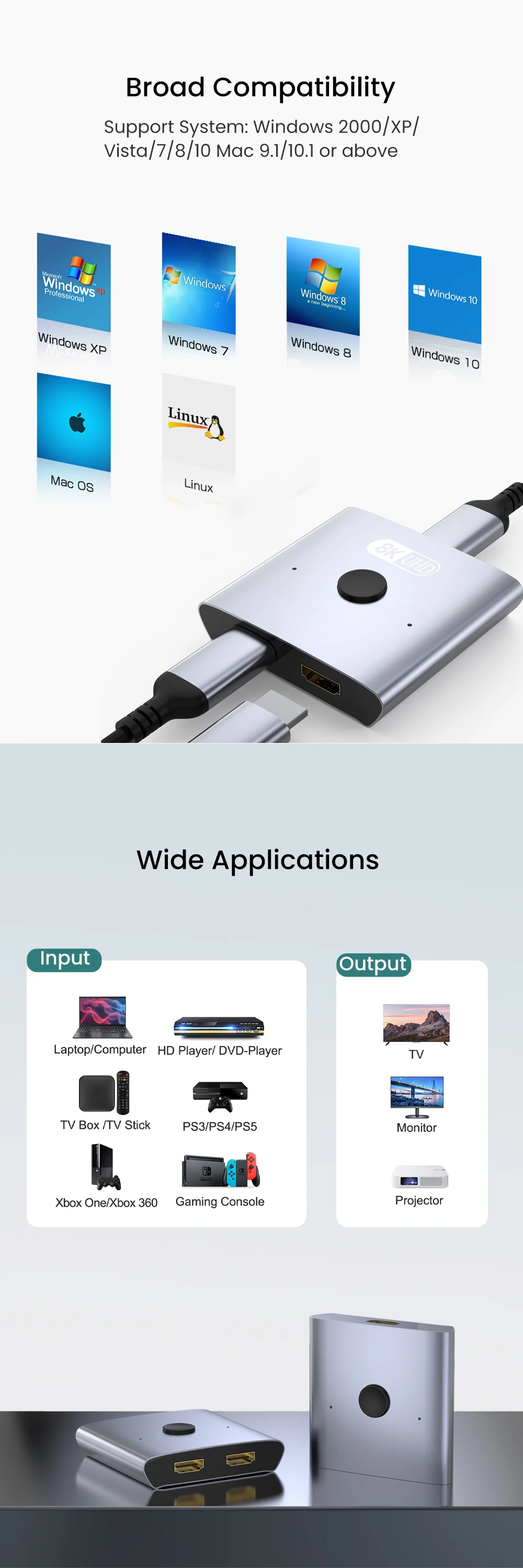 Este conmutador divisor HDMI es altamente compatible con todos los dispositivos que cuentan con interfaces HDMI estándar.Admite una variedad de dispositivos de entrada, incluidas computadoras, Xbox 360, Xbox One, PS5/PS4/PS3, reproductores de DVD Blu-ray, etc., y salidas a televisores, monitores, proyectores HD o Full HD y más.