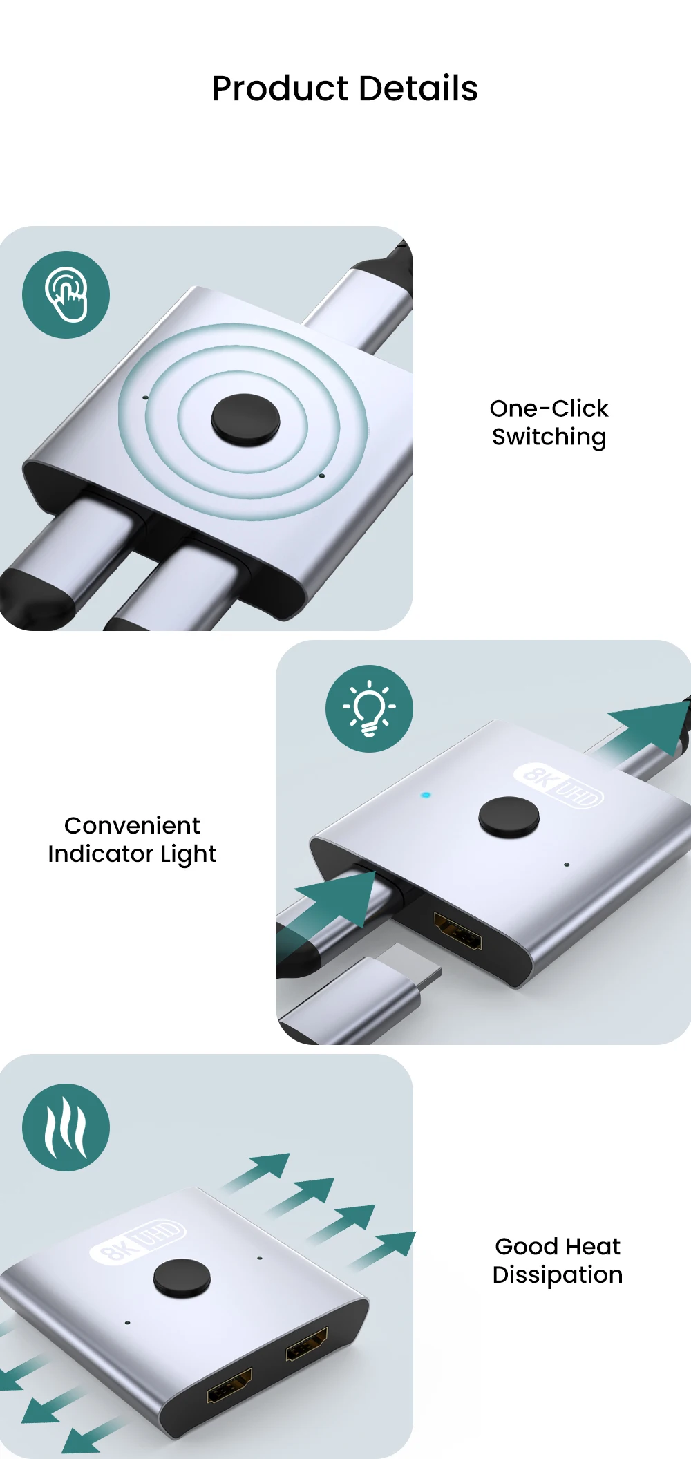 Operar esta caja de conmutación HDMI de 8K es increíblemente fácil; simplemente presione el botón en la caja para cambiar entre fuentes de entrada o salida. Tenga en cuenta que este producto incluye solo el conmutador y no viene con los cables necesarios. Si encuentra algún problema durante el uso, no dude en contactarnos a través del centro de mensajes.