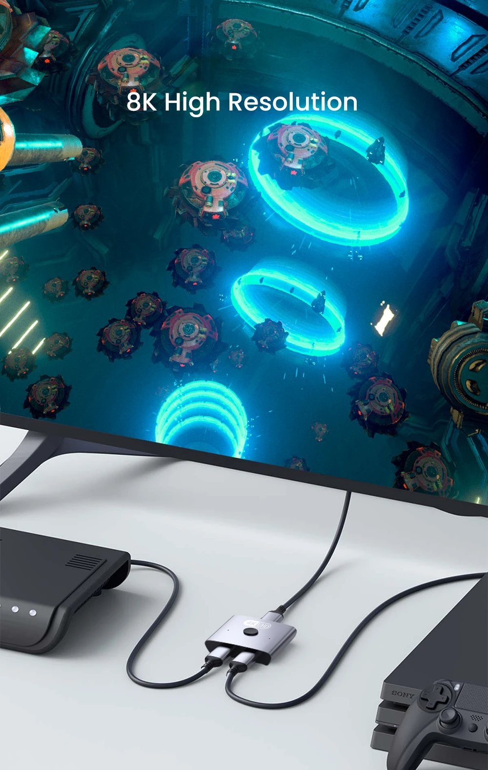 Nuestro concentrador HDMI admite resoluciones de 8K@60Hz, 4K@120Hz (4K@165Hz/144Hz) y es compatible con versiones anteriores de 2K@240Hz, 1080P@240Hz, ofreciendo una velocidad de transmisión de hasta 48Gbps.Mejorado con VRR, HDR dinámico, croma 4:2/4:2:2/4:4:4 y compatible con los estándares Dolby Vision y HDCP 2.2, garantiza una experiencia de juego más fluida y receptiva e imágenes más claras y realistas.Para utilizar una resolución de 8K u otras altas resoluciones y tasas de actualización, conecte dispositivos usando un cable HDMI 2.1.