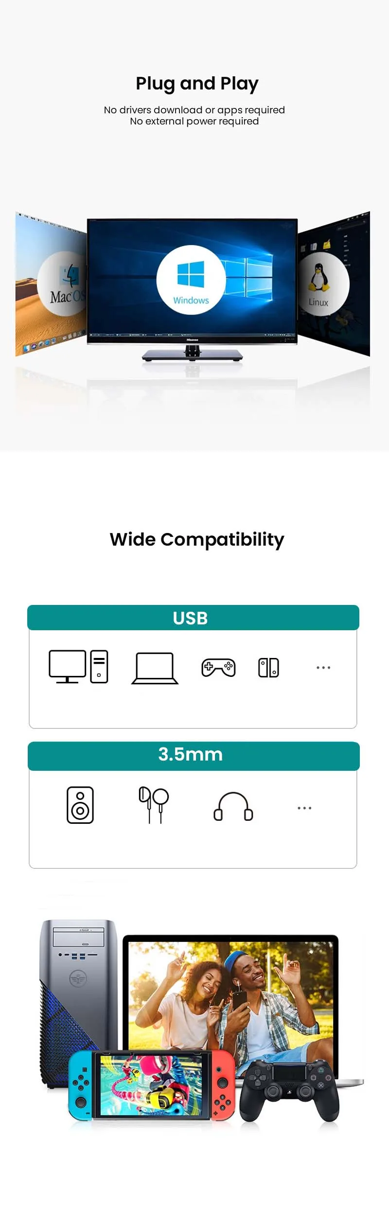 • Adaptador de conector de audio de USB a 3,5mm:Convierta USB a conector de audio de 3,5mm, lo que le permite conectar su teléfono o computadora portátil a una gama más amplia de dispositivos.