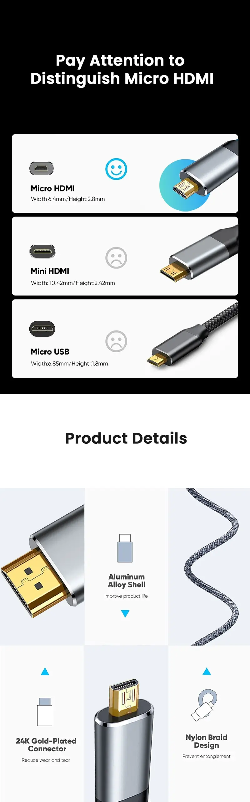 【Micro HDMI Cable-4K @ 60Hz 】: Disfrute de la notable resolución Full HD de 4K @ 60Hz y 2K @ 165Hz con nuestro adaptador de cable Micro HDMI a HDMI, compatible con la resolución Full HD de 1080P, canal de retorno de audio (ARC). Sumérjase en imágenes realistas y Marcos suaves, brindando una experiencia de pantalla 3D sin igual. Tenga en cuenta que este producto está diseñado específicamente para conexiones Micro HDMI a HDMI estándar, no para conexiones Micro USB a HDMI o HDMI a HDMI.