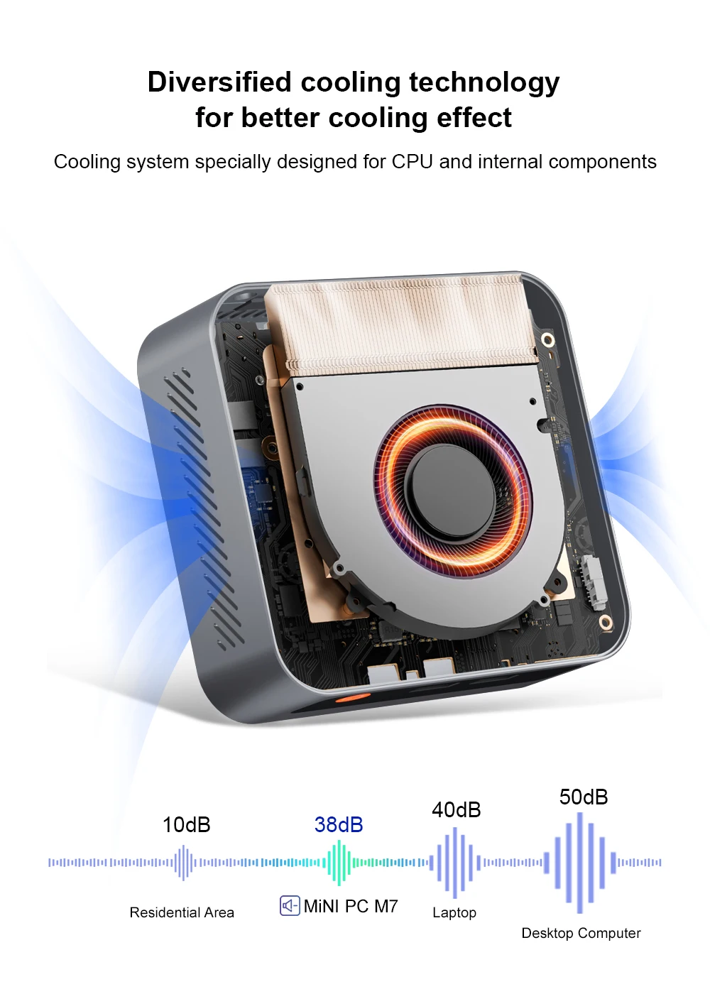 Con un sistema de refrigeración especialmente diseñado para la CPU y los componentes internos, este dispositivo mantiene bajas las temperaturas sin ruido.Funciona con solo 38 dB, es significativamente más silencioso que las computadoras portátiles y de escritorio típicas, perfecto para entornos tranquilos de hogar u oficina.